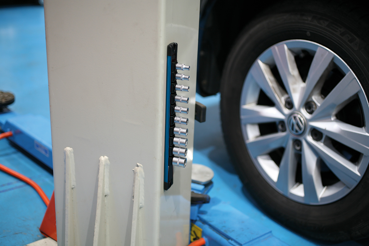 A new patented socket storage rail which allows sockets to be quickly and easily locked and unlocked. Designed to prevent the sockets from falling off when the rail is being removed from the tool chest for use. Each rail features two strong Neodymium Iron Boron (NdFeB rare earth) magnets to ensure it stays attached to the toolbox drawer base or the outside of the toolbox, even when full of sockets. Soft backing cover ensures damage free use. Also equipped with mounting holes for permanent attachment to non-ferrous surfaces. Can be used for vertical storage on shadow boards etc.