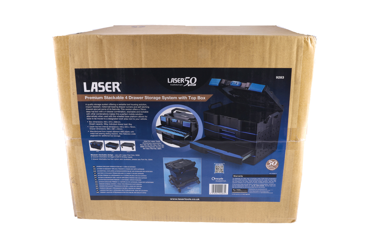 - Modular stackable design, for use with Laser Part Nos. 9285 (2 drawer stackable storage) & 62919 (trolley base). 2 drawer stackable top box also available, please see Part No. 9284.