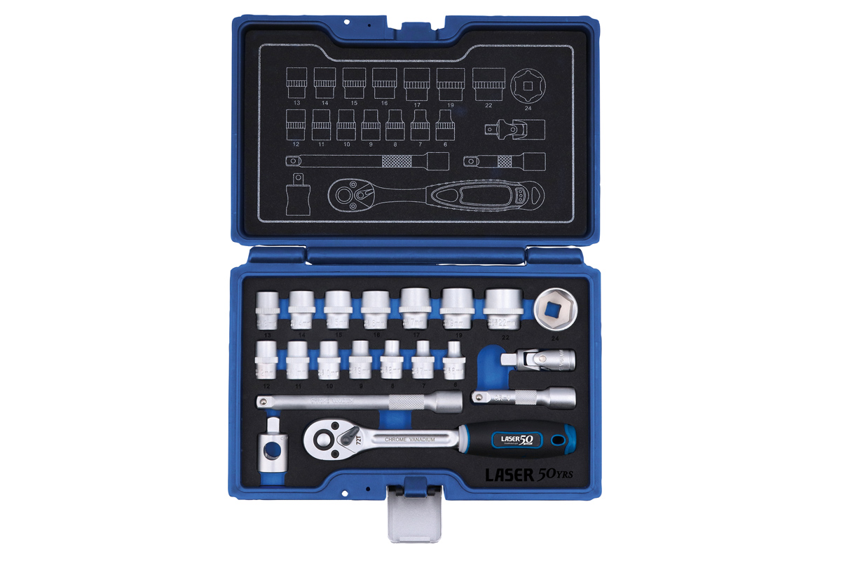 A 20-piece Chrome Vanadium socket set with a hard-wearing, functional satin chrome finish, the Laser 9325 3/8" drive set is supplied in an easy-to-store, impact-resistant case, designed to last 50 years or more. Chrome Vanadium steel offers exceptional strength, durability and resistance to corrosion, making it ideal for demanding tasks and environments. The added chromium protects against rust, while the vanadium enhances toughness and wear resistance. Launched to celebrate Laser Tools 50th year and covered by the Laser Tools special 50-year limited warranty (see website for details).