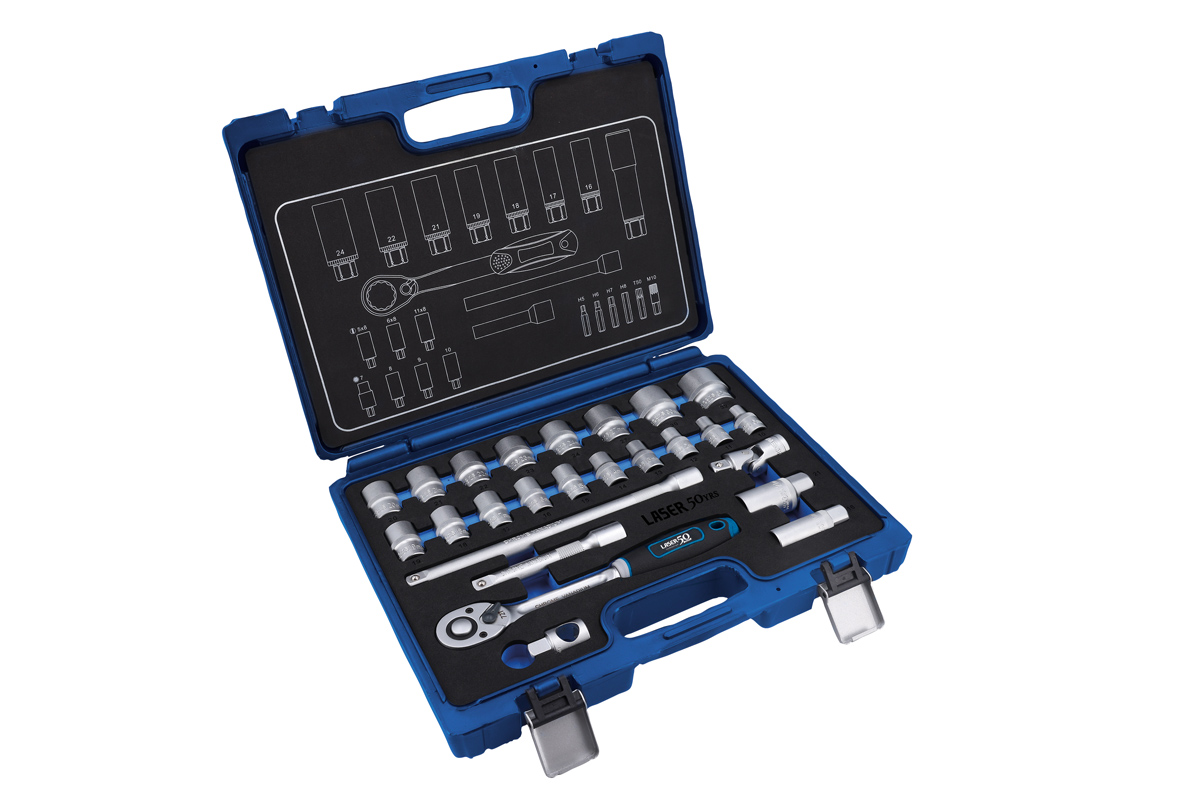 A 25-piece Chrome Vanadium socket set with a hard-wearing, functional satin chrome finish, the Laser 9325 1/2" drive set is supplied in an easy-to-store, impact-resistant case, designed to last 50 years or more. Chrome Vanadium steel offers exceptional strength, durability and resistance to corrosion, making it ideal for demanding tasks and environments. The added chromium protects against rust, while the vanadium enhances toughness and wear resistance. Launched to celebrate Laser Tools 50th year and covered by the Laser Tools special 50-year limited warranty (see website for details).