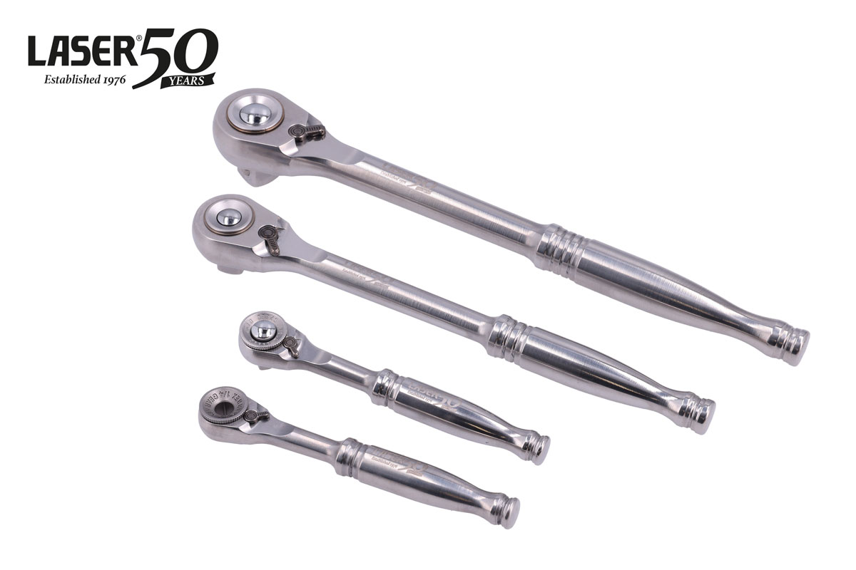 A 4-piece high quality kit resistant to rust & corrosion made up of a 1/2", 3/8" & 1/4" square drive & 1/4" hex drive fine toothed ratchets, manufactured from stainless steel for a long-lasting life. Supplied in tool box ready engineered EVA foam (280 x 131 x 30mm). Launched to celebrate Laser Tools 50th year and covered by the Laser Tools special 50-year limited warranty (see website for details).