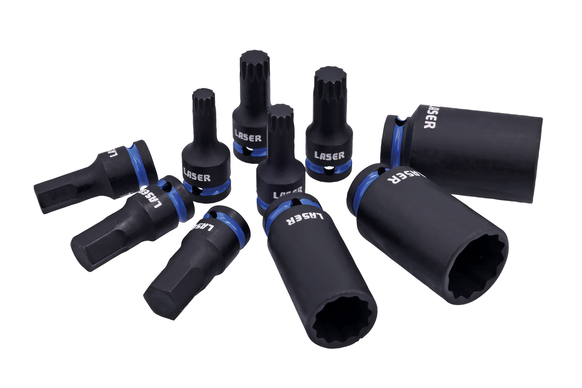 A 10-piece 1/2" drive set of deep Bi-Hex (12-point) impact sockets, triple square bit sockets, and hex bit sockets for late-model Volkswagen Group vehicles from 2000 to 2025. Manufactured from chrome molybdenum and supplied in a toolbox-ready engineered EVA foam tray (280 x 197 x 37mm). Launched to celebrate Laser Tools 50th year and covered by the Laser Tools special 50-year limited warranty (see website for details).
