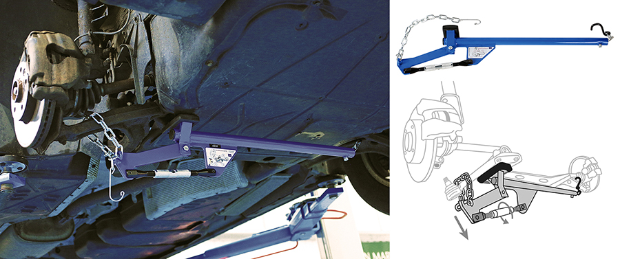 When removing ball joints, control arms and suspension struts it’s always a struggle to hold the lower suspension arm out of the way; even with a dedicated suspension arm lever, you’re wrestling against the anti-roll bar and it feels like you need a third hand.