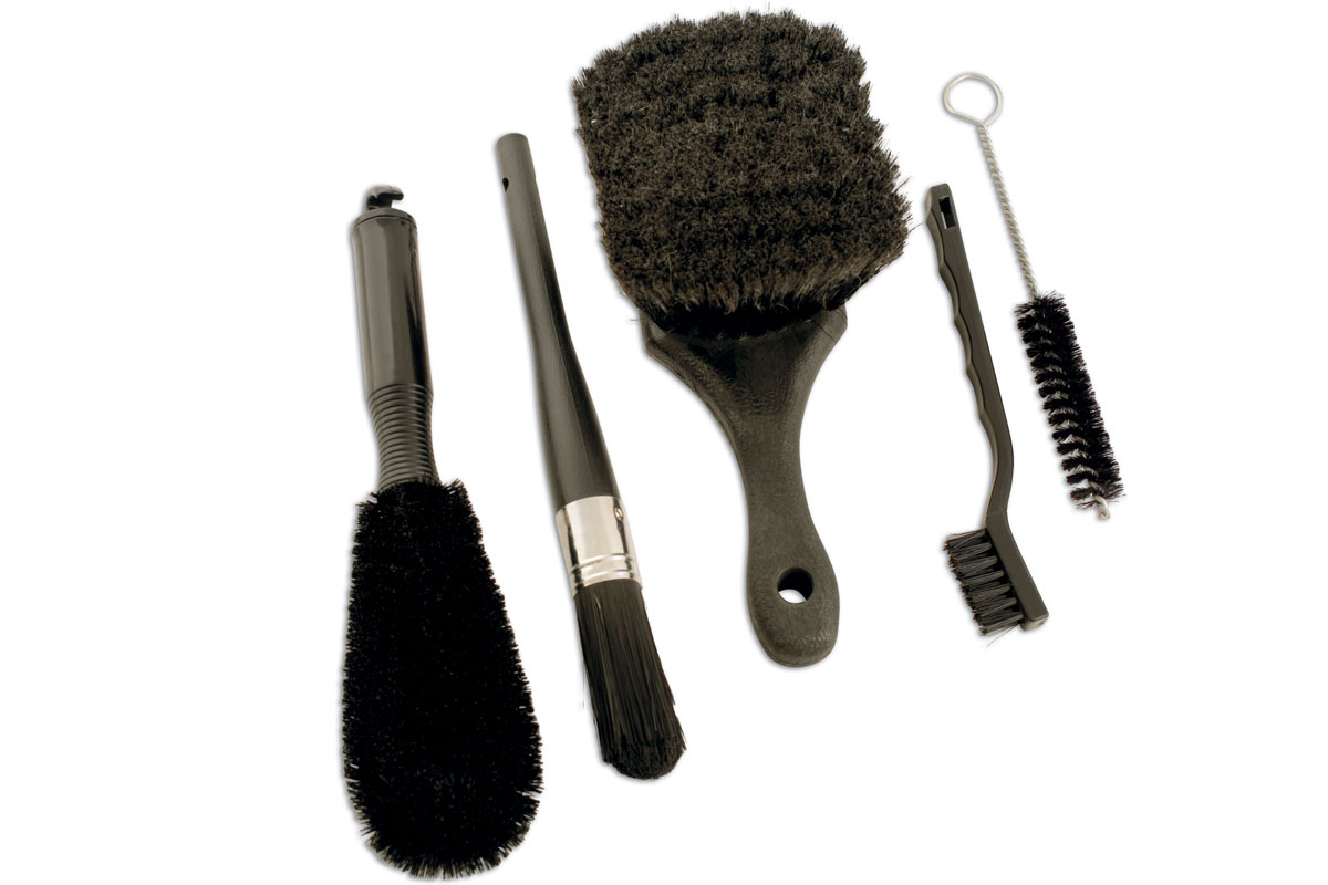 This comprehensive cleaning set includes five specialist brushes chosen to deliver excellent automotive and bike cleaning. The set has two large brushes with soft, non-marking bristles that are perfect for cleaning bodywork and alloy wheels whilst the range of smaller brushes are ideal for detailed and intricate cleaning of gear wheels, chains, grill vents and wire wheels. The full set includes a wide bodywork brush, alloy wheel brush, round detail brush (head diameter), spiral wire brush and a handled short head brush. Cleaning is easier, quicker and better with the right brush making this set a very useful addition to the automotive workshop.