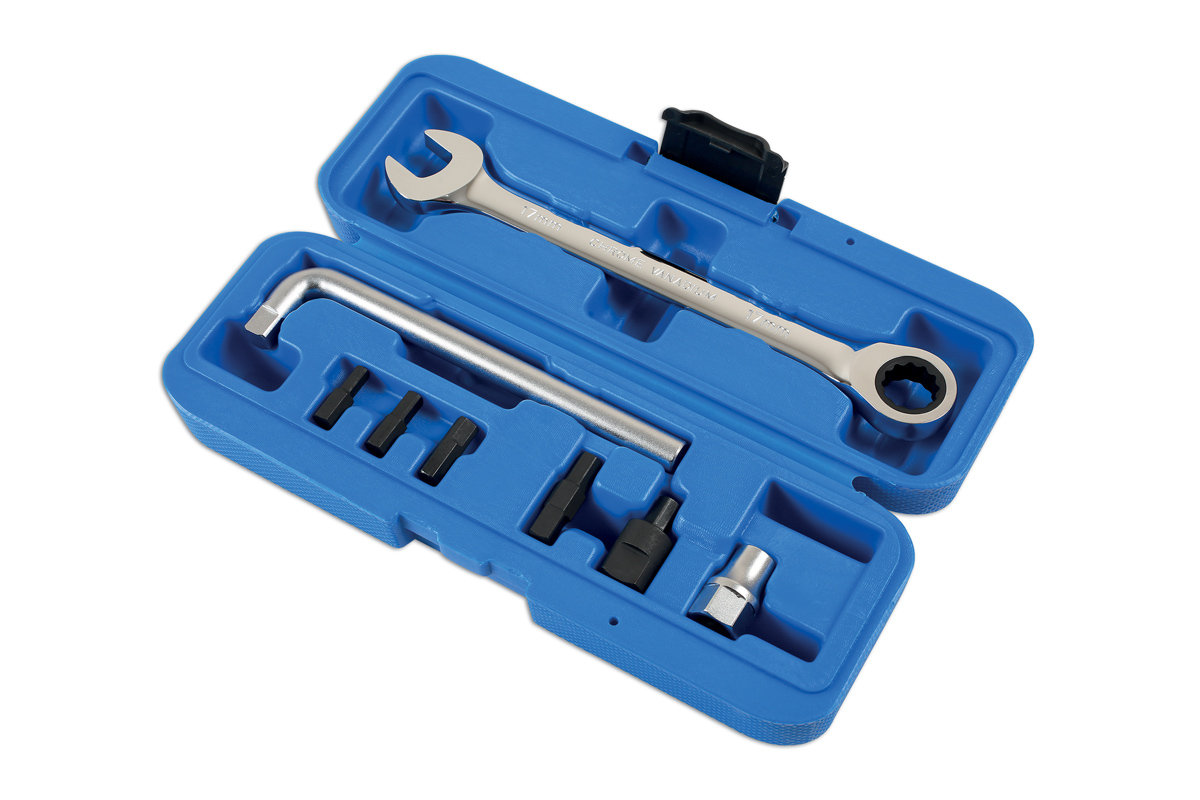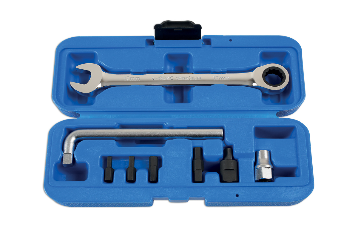 - Kit includes 3/8” square drive handle with bit holder, togther with a 17mm combination ratchet wrench for use where access does not allow the use of the socket & drive handle combination.