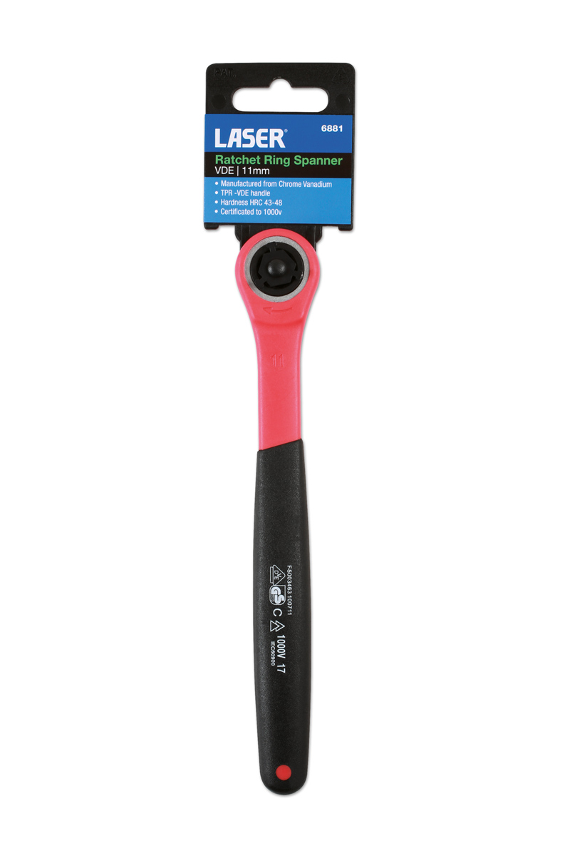 Insulated, VDE certified ratchet ring spanner 11mm, to IEC60900 standards for 1000vAC/1500vDC live working.