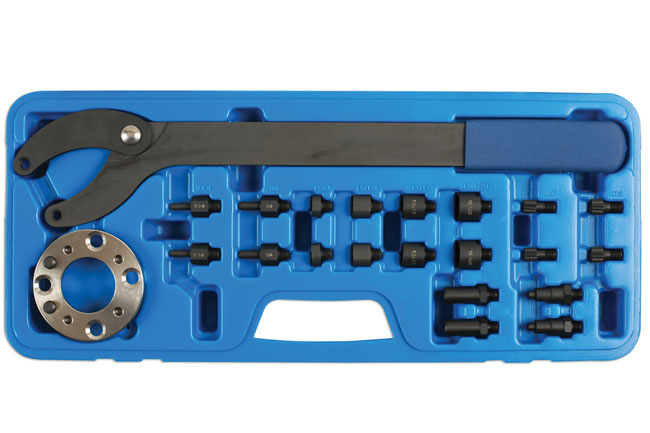 Uitgebreide borggereedschapsset voor riemschijf, geschikt voor voertuigen van de VAG Group. Ontworpen om de nokkenas, krukas, olie-en waterpomppoelies, en tandwielen op hun plek te houden terwijl de bevestigingsbouten los- of vastgeschroefd worden.
