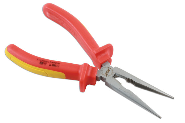 Insulated long nose pliers, part of a wide range of insulated tools from Laser, manufactured from chrome vanadium with satin finish, with high voltage safety grip handles. VDE and IEC60900 certified.