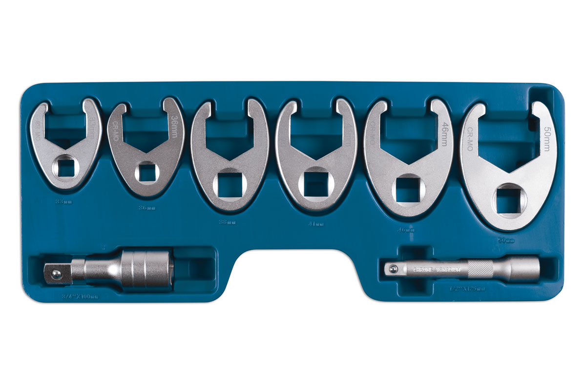 Heavy duty flare nut crows foot wrench set in 1/2"D and 3/4"D, in a range of larger sizes from 33mm to 50mm with a pair of extension bars for deep-set access. The wrenches are machined to tight tolerances with thick jaws for maximum grip, to prevent stripping the fastener head, whilst the open jaw design fits around pipes and cables. A professional quality set that is manufactured from satin finish chrome molybdenum and supplied in a rugged blow mould carry case.
