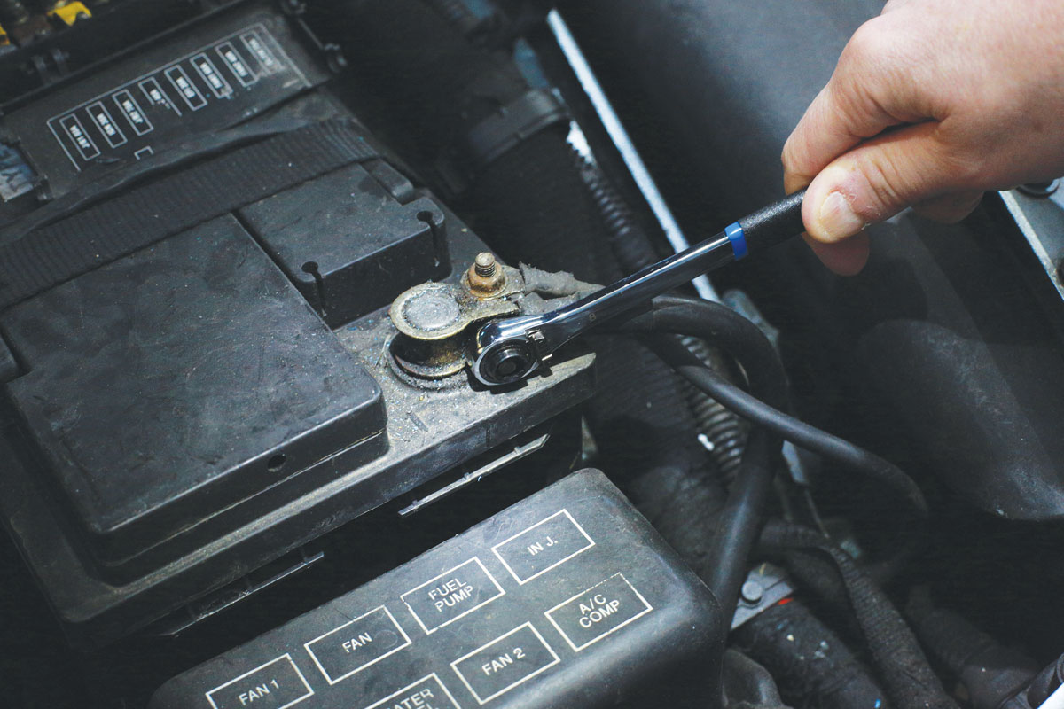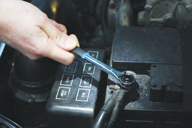 • Tweekoppige ratelsleutel voor batterij-aansluiting.