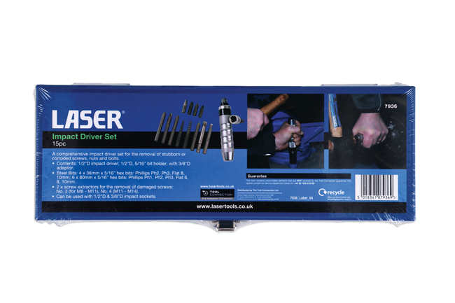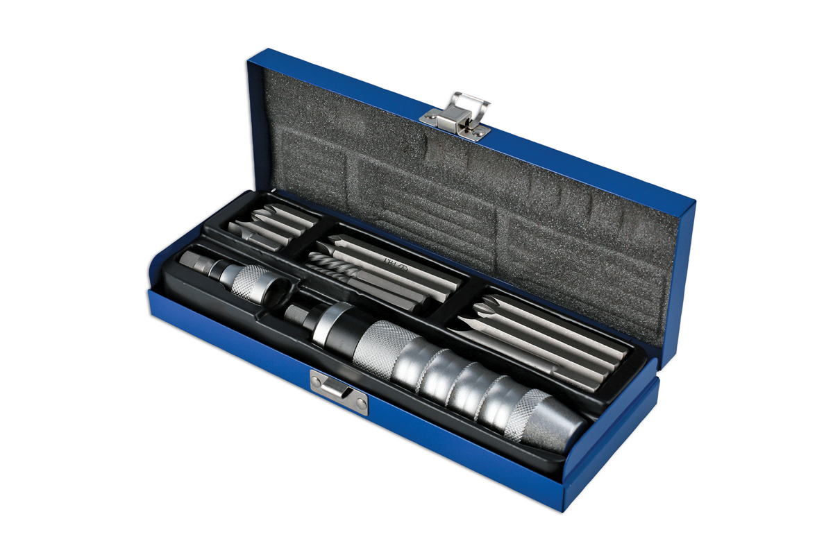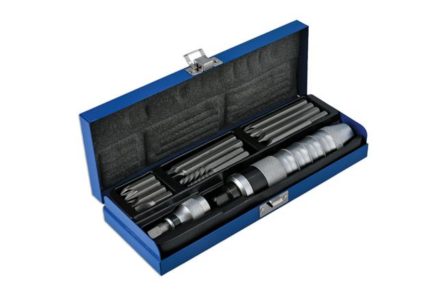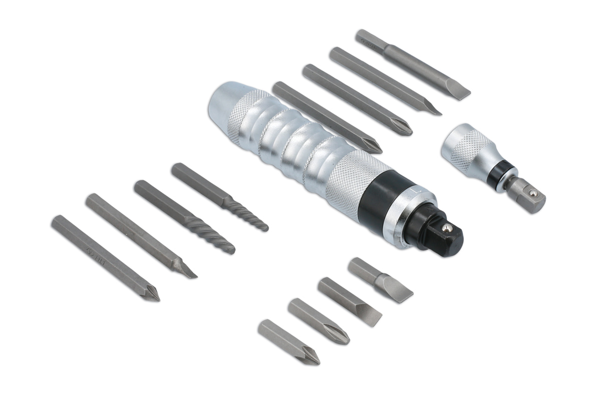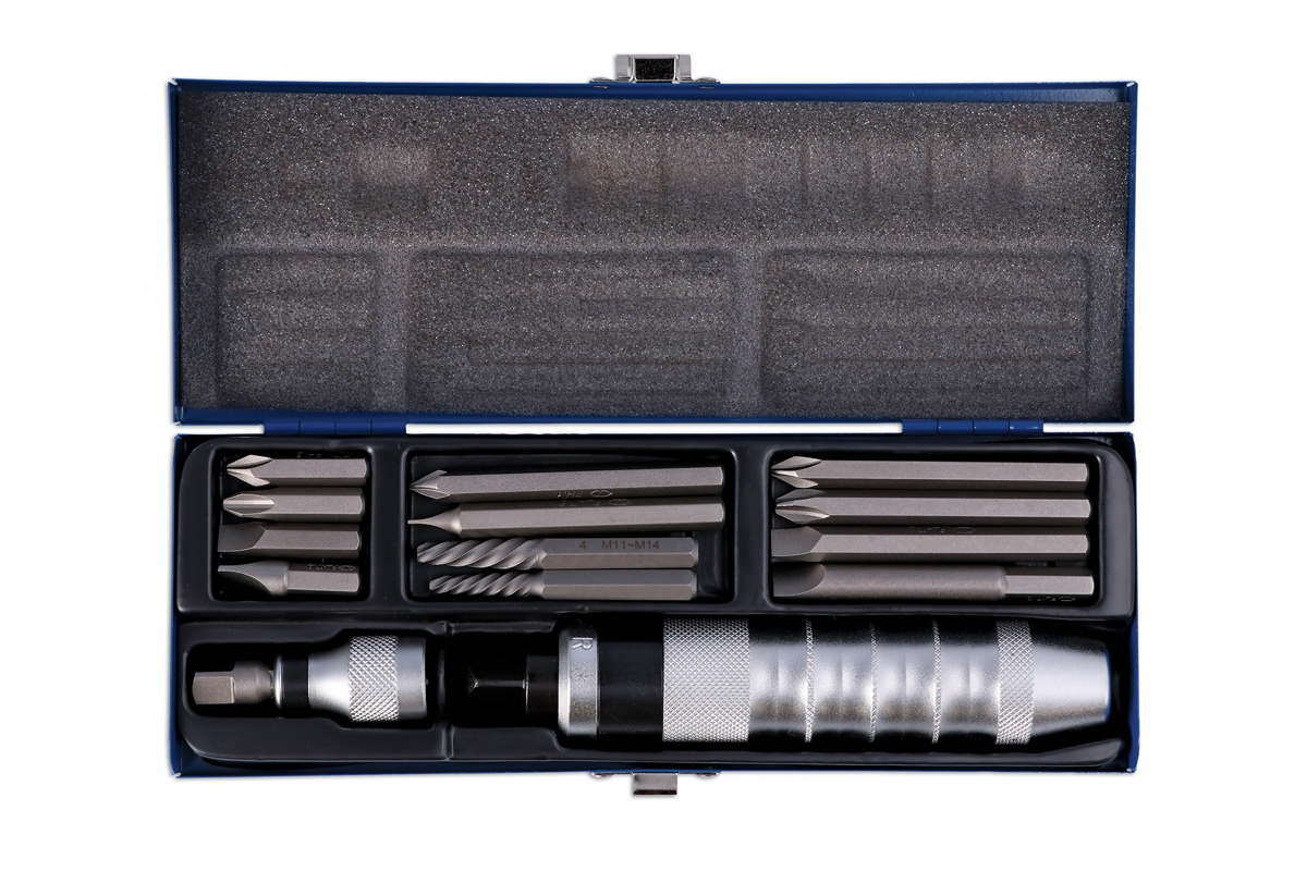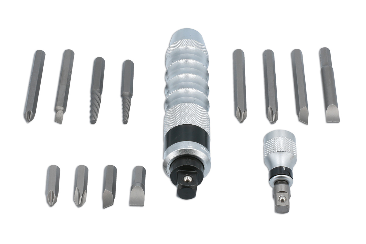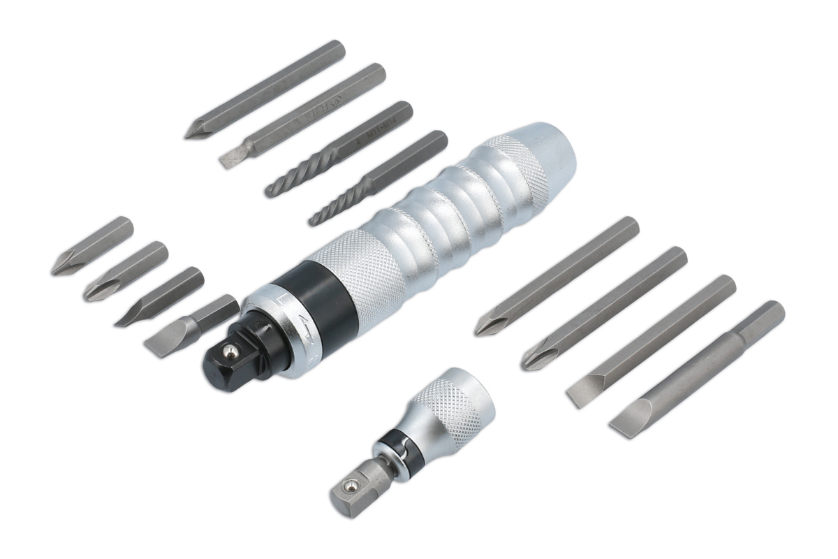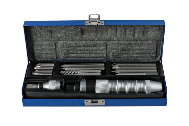 A comprehensive impact driver set for the removal of stubborn or corroded screws, nuts and bolts. It can be used with both 1/2"D and 3/8"D impact sockets, comes with a 5/16" bit holder together with hex bits, Phillips and slotted screwdriver bits and screw extractors for the removal of damaged screws.