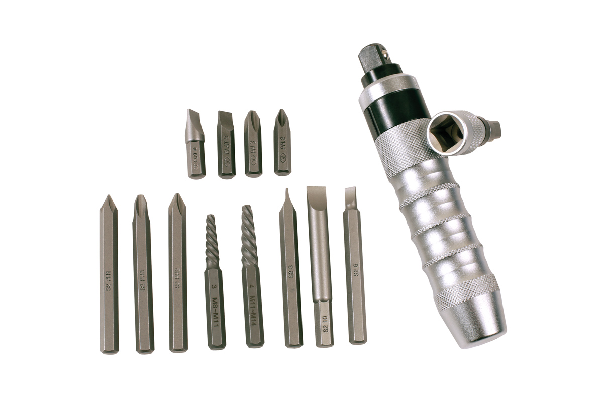 Ensemble complet de tournevis à impact pour la dépose des vis, écrous et boulons tenaces ou corrodés. Utilisable avec des douilles à impact à carré de 1/2" et de 3/8", il comprend un porte-embouts de 5/16" ainsi que des embouts hexagonaux, des embouts de tournevis cruciforme et fendus, et des extracteurs de vis pour la dépose des vis endommagées.