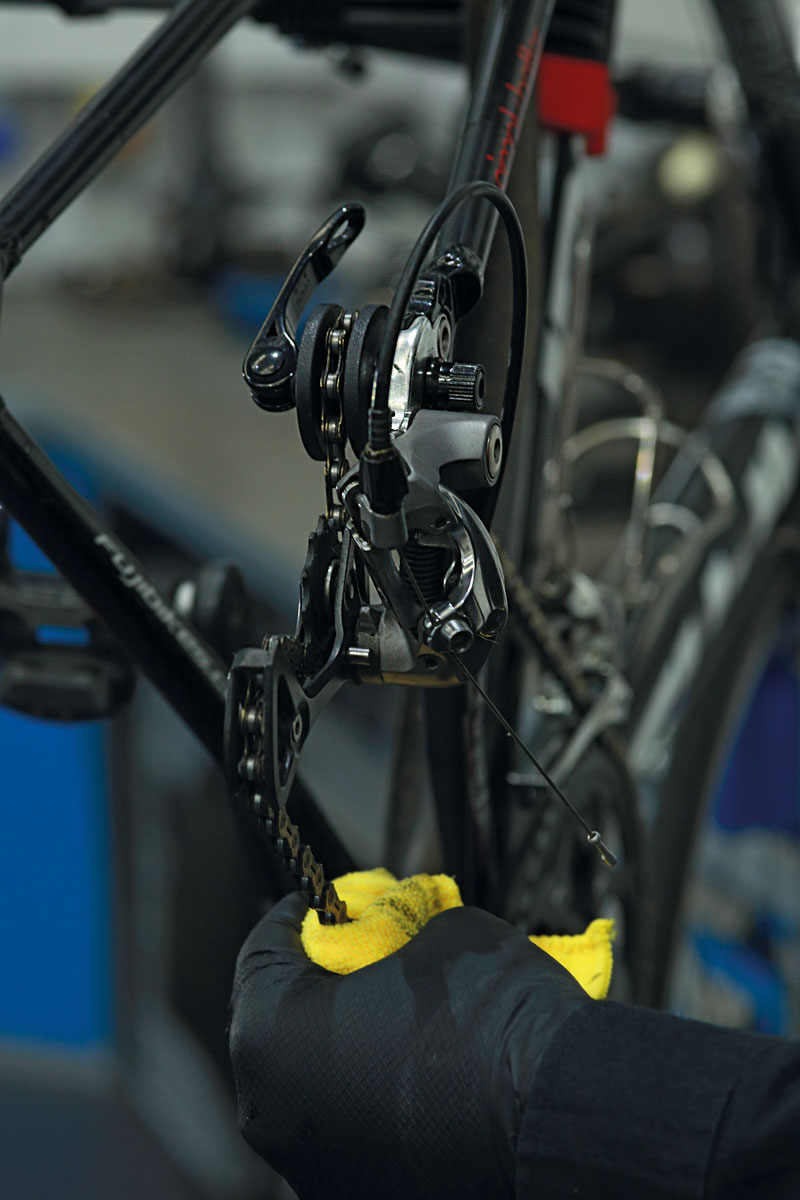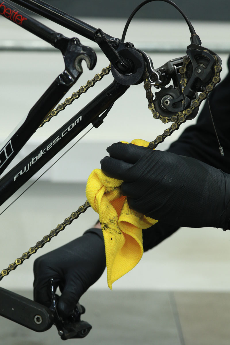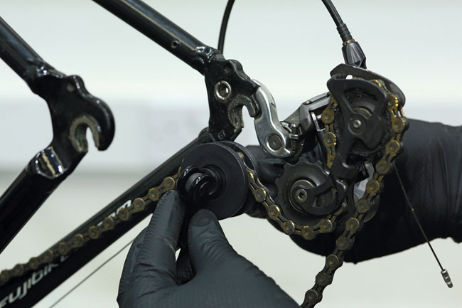 Anbringung anstelle des Hinterrads an der Antriebsseite des Rahmens, um die Kette gespannt und vom Rahmen fernzuhalten. Die Kette läuft über eine Spannrolle, sodass die Kurbel sich drehen lässt, um Kette und Kettenschaltung ganz einfach reinigen zu können.