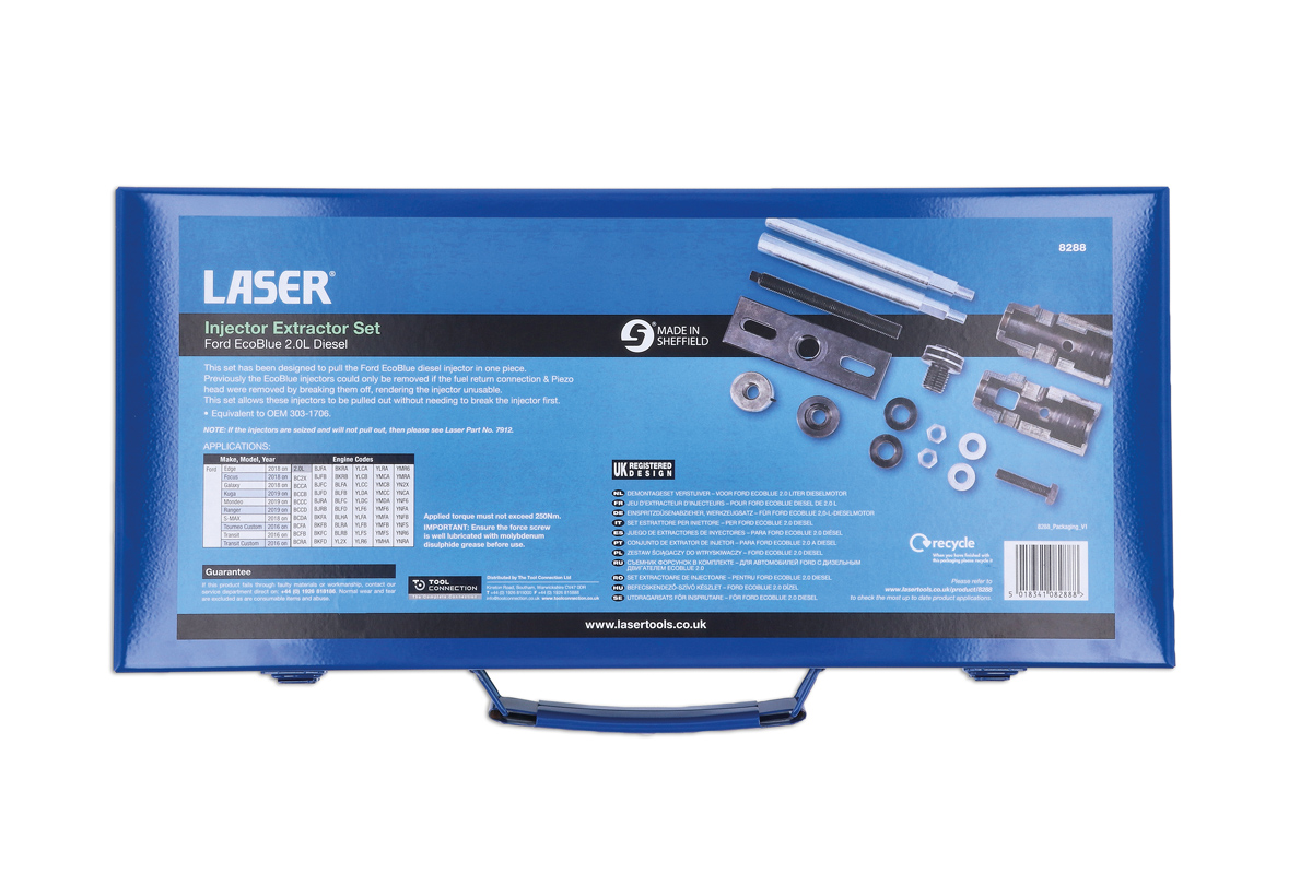 De Laser 8288 injectortrekkerset is ontworpen om de Ford EcoBlue dieselinjector er geheel uit te trekken. Eerder konden de EcoBlue-injectors alleen verwijderd worden als de brandstofteruggaveaansluiting en Piezo-kop verwijderd werden door deze af te breken, waardoor de injector onbruikbaar werd. Met deze set kunnen deze injectors eruit getrokken worden zonder dat de injector eerst kapot gemaakt hoeft te worden. OPMERKING: Als de injectors vastgegrepen worden maar niet kunnen worden uitgetrokken, zie Laser-onderdeelnr. 7912.