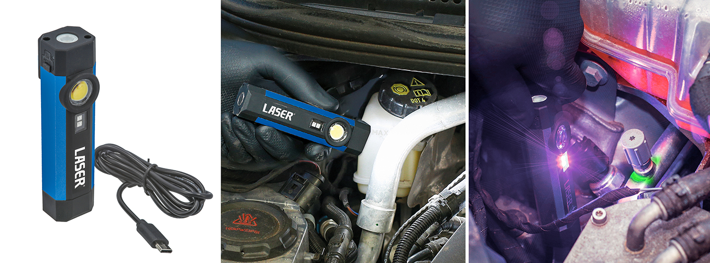 A multi-function aluminium pocket light that combines a 1W LED torch together with a 3W COB lamp and an ultraviolet lamp, making it ideal for use with fluorescent dyes to detect leaks in air conditioning systems. The body has a durable blue anodised body with rubber coated ABS plastic end caps and pocket clip, and it also features two magnets, to allow the light to be easily mounted and shone where needed while keeping the users hands-free to work. It’s powered by a rechargeable 2200mAh lithium-ion battery, and is supplied with a USB Type-C charging cable.