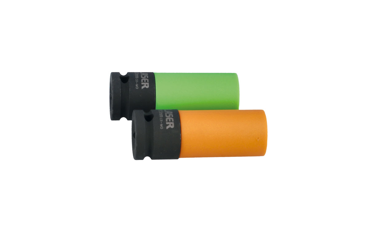 - Dünnwandige Steckschlüsseleinsätze mit Schutzhülse zur Vermeidung von Beschädigung an Leichtmetallfelgen.