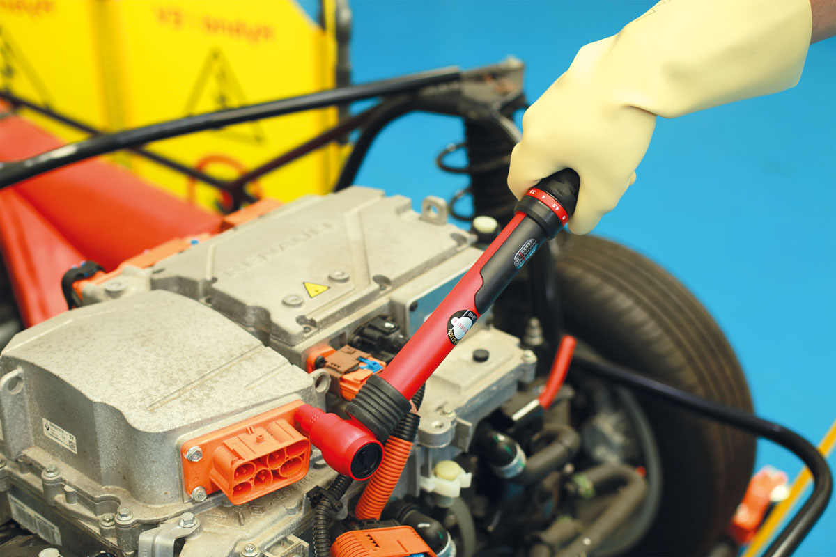 Vollständig isolierter Knack-Drehmomentschlüssel mit 3/8"-Antrieb, 395 mm lang, mit einem Drehmomentbereich von 20-100 Nm. Hergestellt nach IEC60900-Standards für Arbeiten unter 1000 VAC/1500 VDC Spannung und ideal für den Einsatz an Hybrid- und Elektrofahrzeugen. Mit leicht ablesbarer Skala, die Einstellung erfolgt in 0,5-Nm-Schritten über einen ausziehbaren Kragen am Griffunterteil.