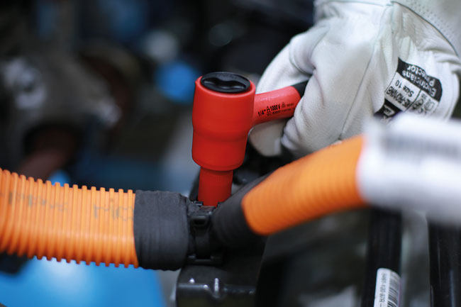 Jeu de douilles entièrement isolées à carré de 1/4'', comprenant une poignée à cliquet à 72 dents, 10 douilles à 6 pans métriques simples et 2 rallonges. Certifié CEI 60900 pour les travaux sous tension jusqu'à 1000 V CA/1 500 V CC. Convient aux techniciens et mécaniciens travaillant sur des véhicules hybrides et électriques, ainsi qu'aux électriciens et installateurs professionnels. Ensemble fourni dans une mallette de transport robuste moulée par soufflage, avec insert en mousse EVA.