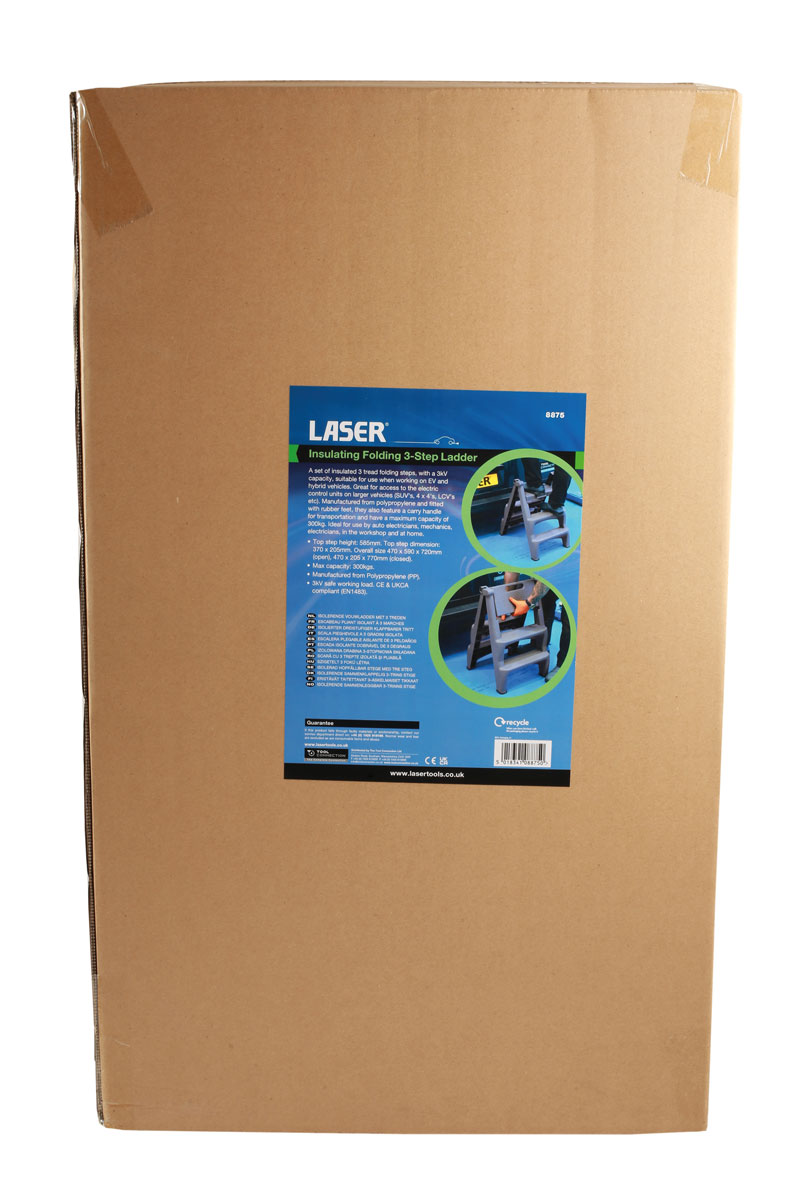 Een geïsoleerde opvouwbare trap met 3 treden en een capaciteit van 3 kV, geschikt voor gebruik bij werkzaamheden aan EV- en hybride auto's. Zeer geschikt voor toegang tot de elektrische regeleenheden op grotere auto's (SUV's, 4x4's, bedrijfswagens enz.). Ze zijn gemaakt van polypropyleen, voorzien van rubberen voetjes en een draaggreep voor transport en hebben een draagvermogen van maximaal 300 kg. Ideaal voor gebruik door auto-elektriciens, monteurs, elektriciens, in de werkplaats en thuis.