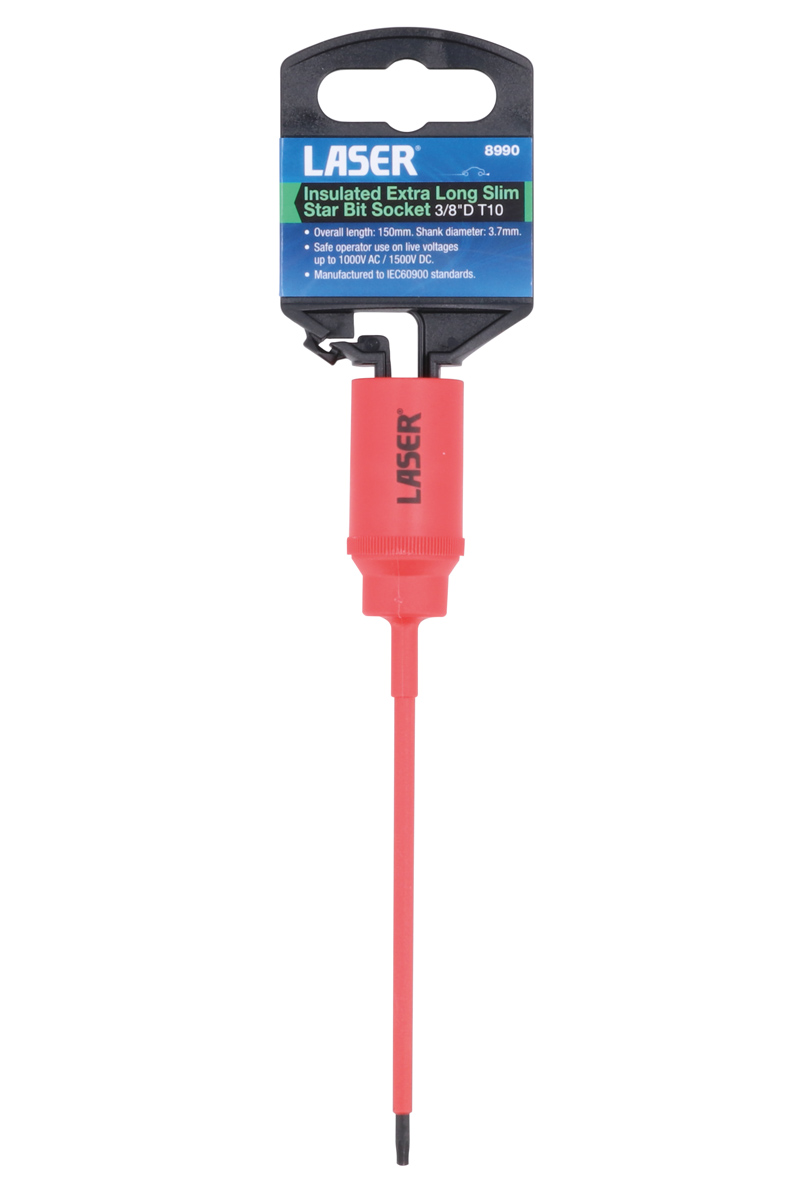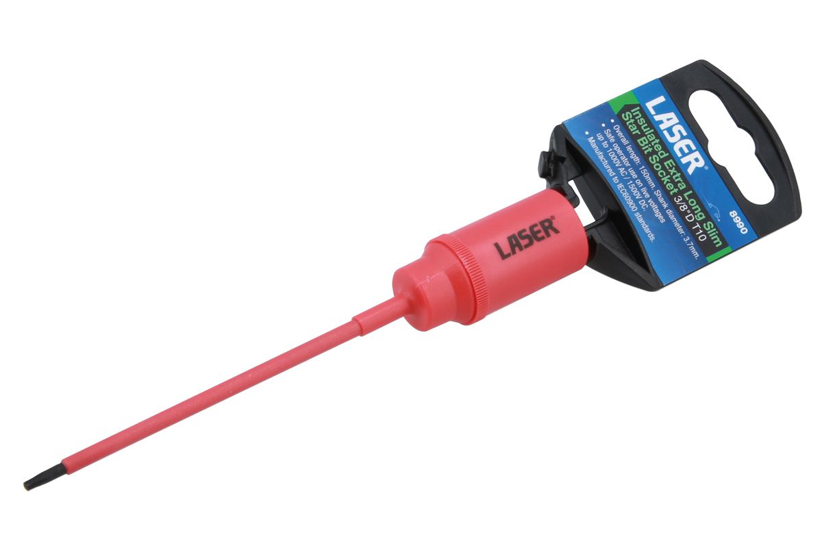 A fully insulated slimline long reach, 3/8” drive, T10 Star* socket bit, suitable for use on restricted access TORX* fixings as found on EV batteries etc. Manufactured to IEC60900 standards, for safe operator use on live circuits up to 1000v AC and 1500v DC, making them ideal for use by electricians, auto electricians or mechanics working on hybrid and electric vehicles or areas where access is restricted. The extra slim overall shaft diameter allows for access between close fitting components where standard electricians long series bit sockets cannot reach.
