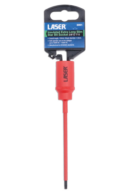 A fully insulated slimline long reach, 3/8” drive, T15 Star* socket bit, suitable for use on restricted access TORX* fixings as found on EV batteries etc. Manufactured to IEC60900 standards, for safe operator use on live circuits up to 1000v AC and 1500v DC, making them ideal for use by electricians, auto electricians or mechanics working on hybrid and electric vehicles or areas where access is restricted. The extra slim overall shaft diameter allows for access between close fitting components where standard electricians long series bit sockets cannot reach.