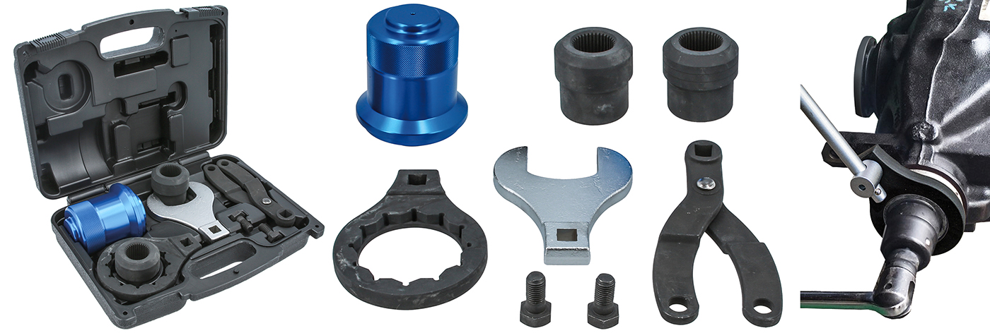 - Verwijder- en montageset voor aandrijfflensmoeren voor BMW (zie toepassingslijst hieronder). De set is ontworpen om te worden gebruikt met 1/2" breekijzers en doppen en bevat steeksleutels met specifieke afmetingen en borggereedschappen waarmee de gebruiker de aandrijfas van de aandrijfflens kan scheiden en vervolgens de aandrijfflens kan verwijderen.