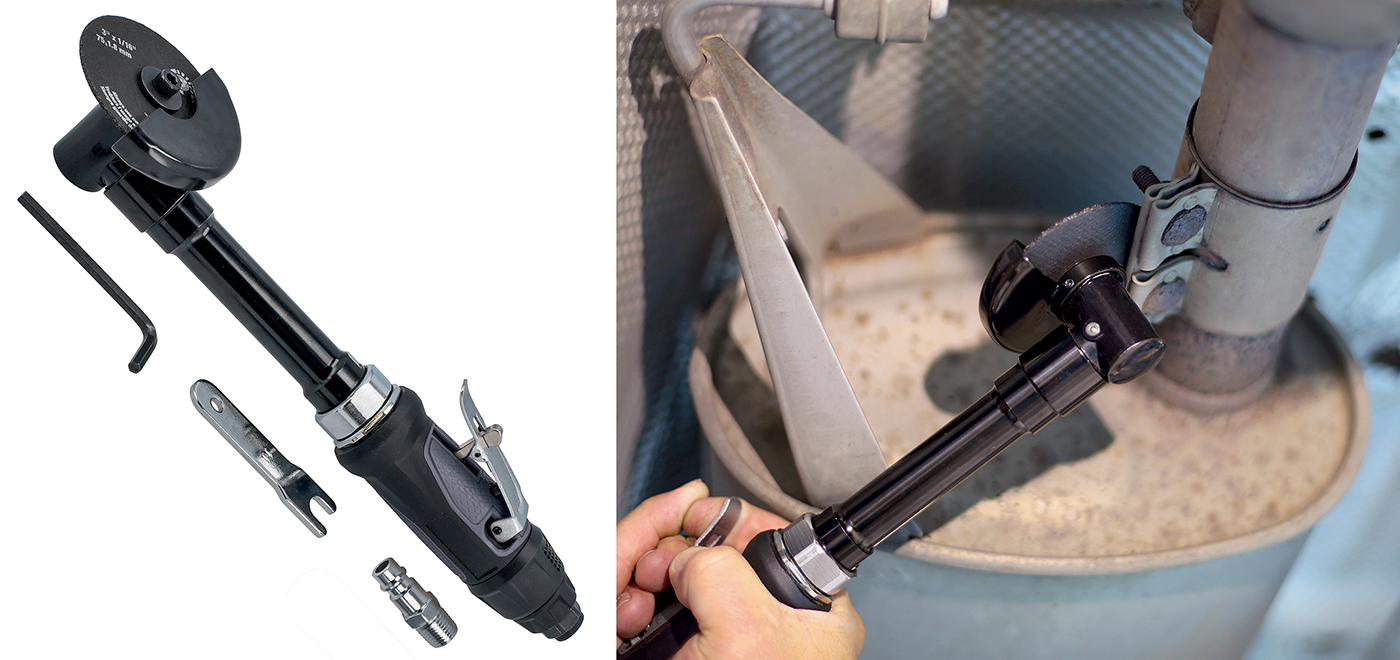 - Pneumatisch doorslijpgereedschap met verlengde hendel voor moeilijk bereikbare plaatsen op een voertuig, geschikt voor het doorslijpen van uitlaten, bevestigingsbeugels, "U"-asbouten en dorpels. Het gereedschap heeft een kopbeschermer, is 360° beweegbaar, en beschikt over een veiligheidshendel om onbedoeld gebruik te voorkomen en een 'softgrip'-hendel in schokbestendig composiet om trillingen en vermoeidheid bij de gebruiker te helpen verminderen. Ontworpen voor gebruik met standaard doorslijpschijven van 3" (75 mm).