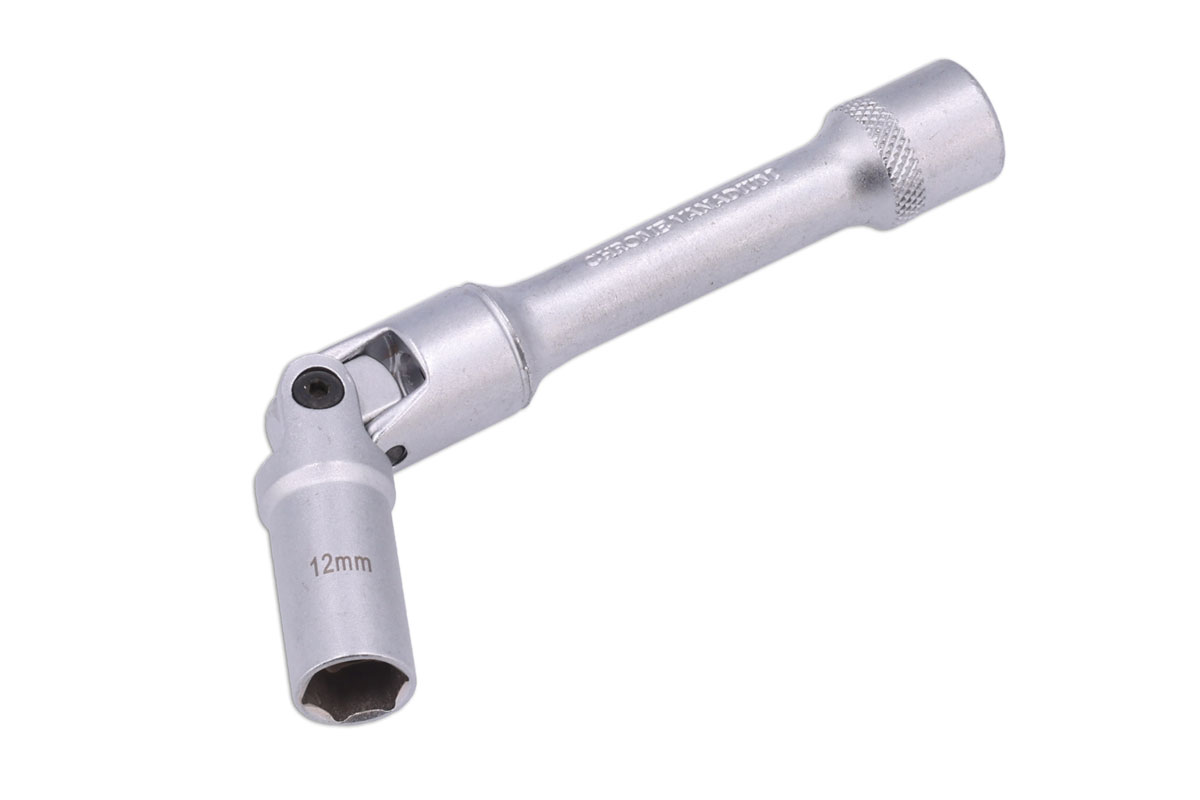 A single Hex (6pt), 12mm extra-long glow plug / spark plug socket with universal joint for restricted access and designed to grip plug being extracted.