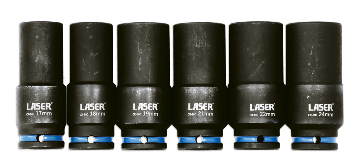 In response to requests from customers, Laser Tools have expanded on the range of weighted sockets. The Laser 9172 6 pc socket set features six 1/2"D sockets all sized to better suit the UK and European car parc. The increased weight designed into these sockets reduces impact losses, increasing the effective torque delivered by the impact gun.