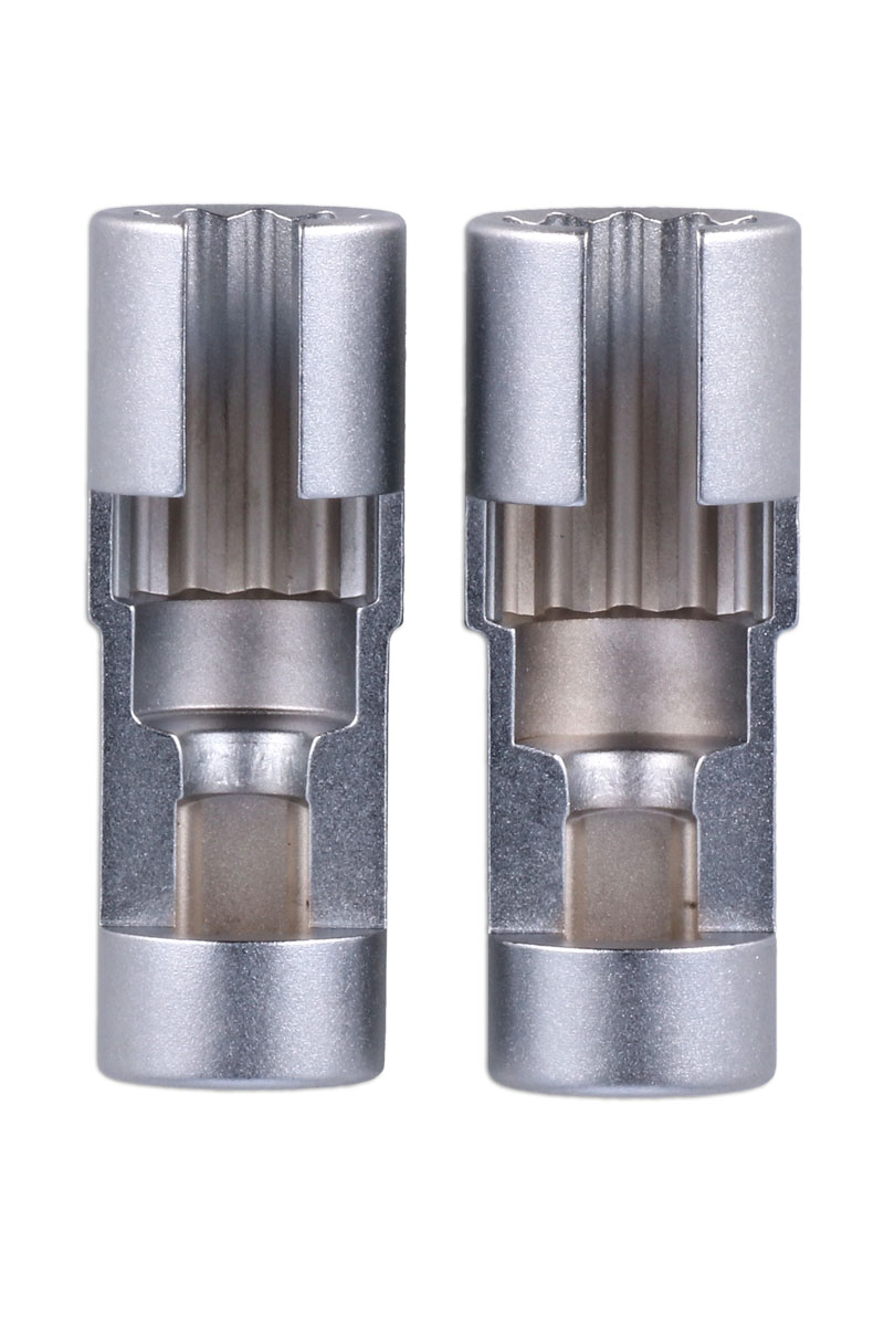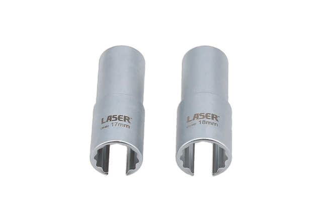 A set of 2 specially dimensioned Bi-hex injector pipe gland nut sockets. The sockets outer dimensions have been significantly reduced to ensure you can easily make full contact with the 17mm and 18mm pipe nuts found used on Piezo style injectors with top mounted pipes.