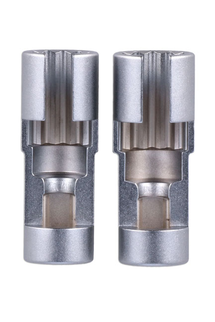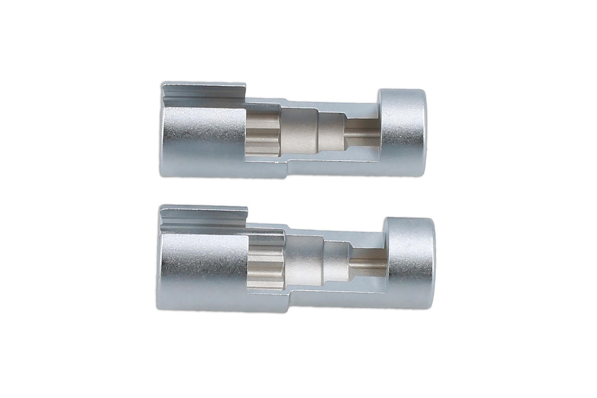 Ein Satz von zwei speziell dimensionierten Doppelsechskant-Steckschlüsseleinsätzen für Einspritzrohr-Verschraubungsmuttern. Der Außendurchmesser der Einsätze wurden erheblich verringert, um einen einfachen und vollständigen Kontakt mit den 17-mm- und 18-mm-Rohrverschraubungen an Piezo-Einspritzdüsen mit obenliegenden Leitungen zu gewährleisten.