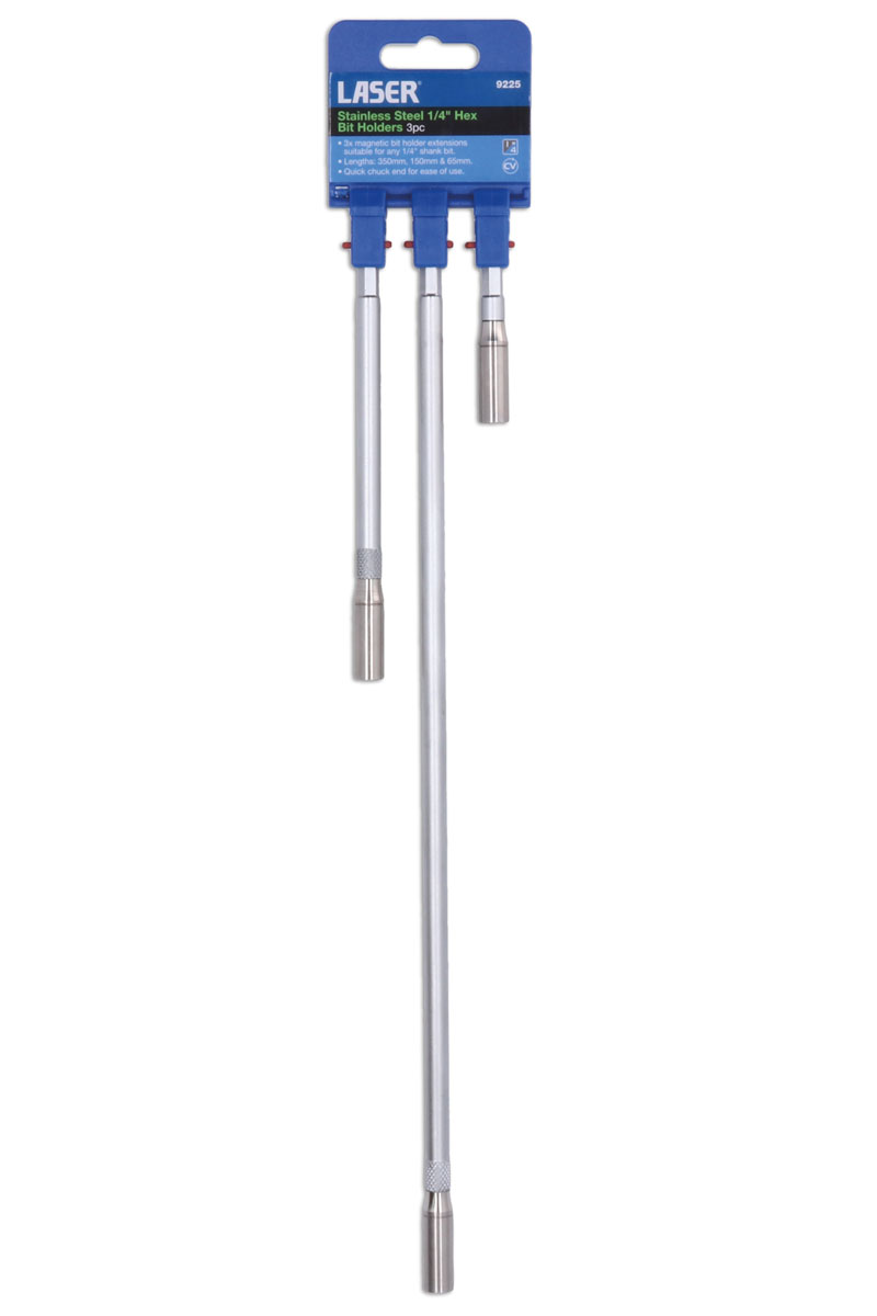 A set of 3 magnetic bit holder extensions, each fitted with a quick chuck and suitable for both cordless drills and bit drivers. Each holder features a stainless steel body welded to a chrome vanadium shank, providing corrosion resistance where it is most needed and high torque strength where it counts. The stainless section resists rust and wear, ensuring bits remain easy to insert and remove even after prolonged use in demanding workshop environments, while the chrome vanadium shank delivers the strength and durability required for power tool operation. An ideal companion kit for any 1/4 inch hex bit set.