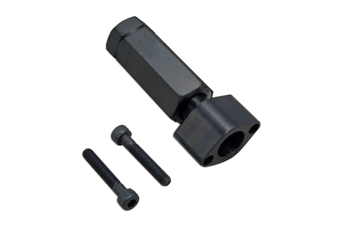 Les modèles récents de moteurs à essence et injection directe de 1.0 L et 1.4 L équipant les gammes Vauxhall, Opel et MG sont munis d’un petit injecteur de carburant à fixation centrale. Ces injecteurs sont placés en position basse entre les arbres à cames et alignés aux bougies d’allumage. Il est devenu évident que le retrait de ces injecteurs nécessite une force considérable. La méthode la plus efficace consiste à utiliser un marteau à inertie et un adaptateur de taille appropriée. L’adaptateur de dépose d’injecteur Laser 9312 est spécialement conçu pour être boulonné directement au support de la rampe d’injection, permettant d’utiliser un marteau à inertie fileté 5/8" UNF, tel que le marteau à inertie Laser de 2,2 kg (disponible séparément, référence 5850). REMARQUE : Les injecteurs sont inclinés vers l’avant du moteur et doivent être dégagés en suivant le même angle pour éviter de les plier.