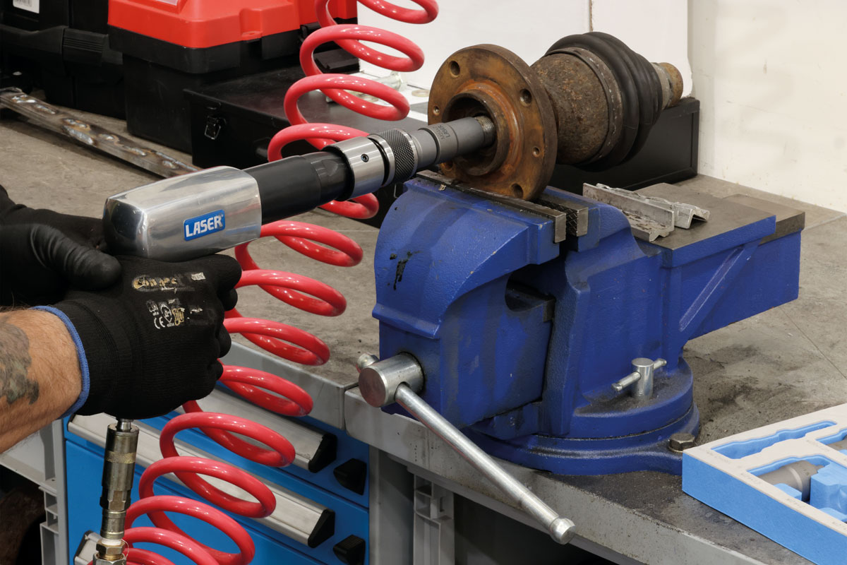 Viele Fahrzeughersteller verwenden mit Keilwellen verbundene Antriebsnaben. Um eine Bewegung in der Baugruppe zu verhindern, montieren einige Hersteller die ineinandergreifenden Keilwellen mit Dichtmittel, was die Demontage erschwert. Laser 9322 ist ein Satz von sieben Adaptern für Antriebswellen, mit denen festsitzende Antriebswellen aus der Nabe gedrückt werden können, ohne das Gewinde zu beschädigen. Vorgesehen für die Verwendung mit einem Drucklufthammer und geliefert in einer Schale aus EVA-Schaum, die in übliche Werkzeugkästen passt.