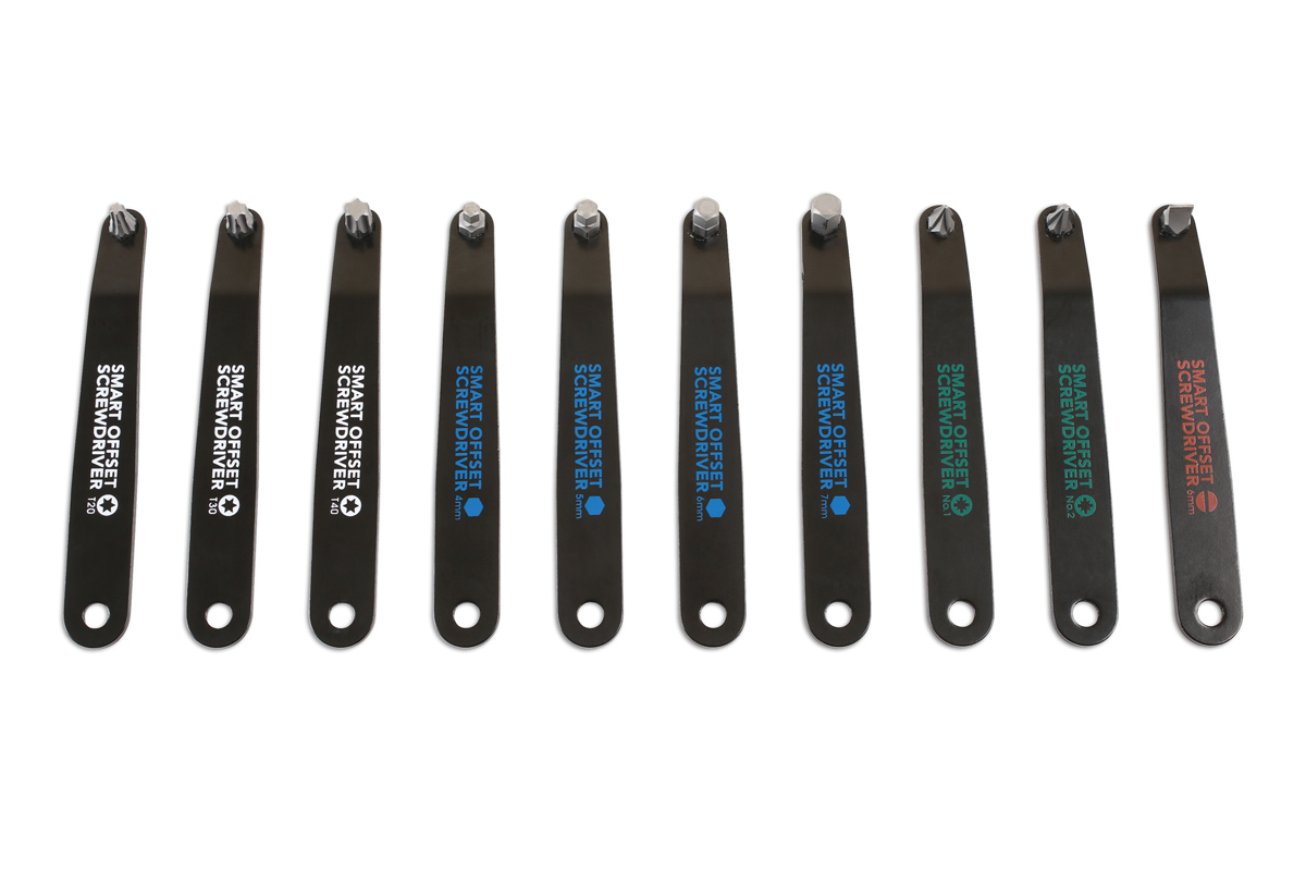 When a fastener is buried in the engine bay (or any other inaccessible area), and you just cannot get a screwdriver or hex key onto to it, try this innovative new 10-piece Low Profile Offset tool kit (part number 6709) from Laser Tools.