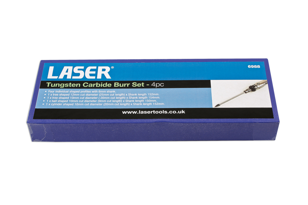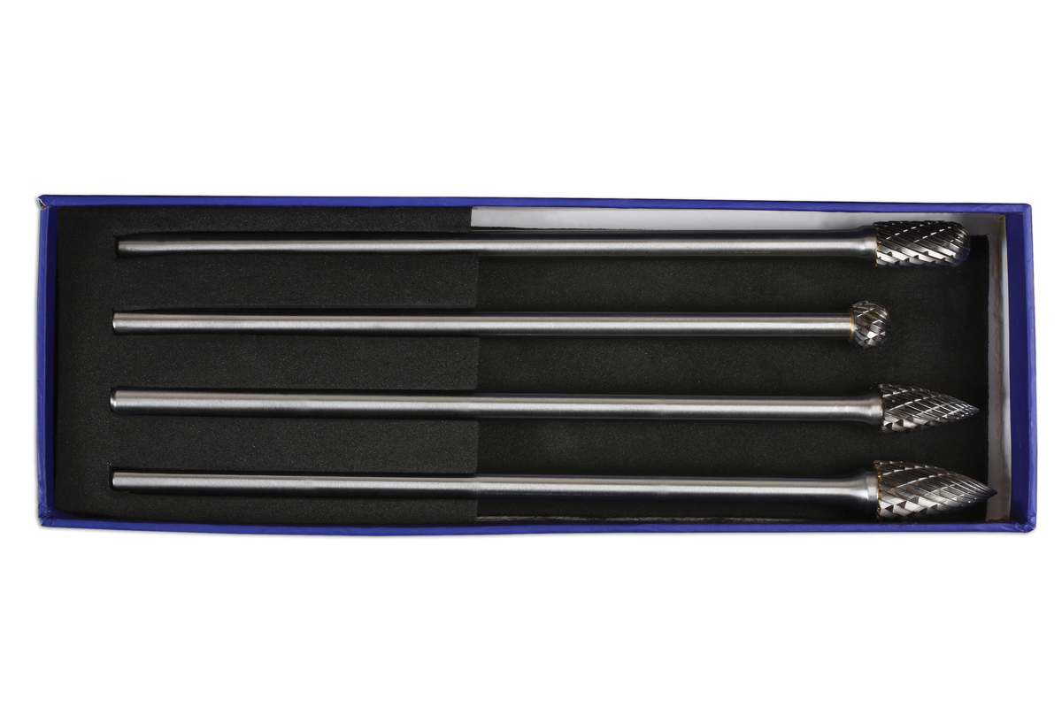 A 4 piece tungsten carbide burr set for cutting, shaping, grinding and for the removal of sharp edges.