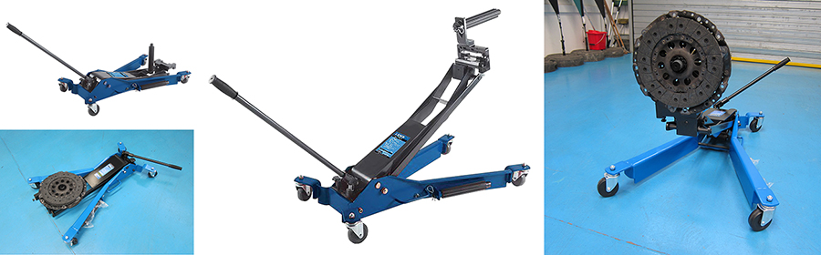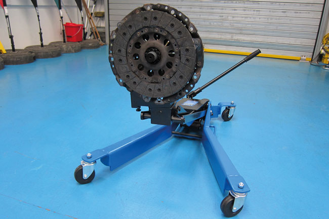 When refitting, the clutch/flywheel assembly is built up onto the splined shaft and support saddle; the low profile of the jack and assembled clutch and the four smooth-action castors make it easy to move into position under the vehicle. The whole saddle/clutch/flywheel assembly is then rotated through 90° and then jacked up into position for fitting. The smooth hydraulic mechanism makes this a very easy job and once at the correct height, the support saddle is fully adjustable to ensure that the clutch assembly lines up straight onto the engine. Two sizes of splined shaft are provided.