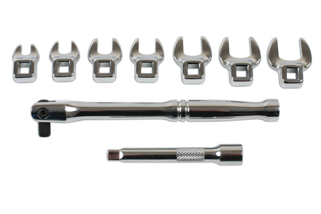 A set of nine crows foot wrenches in a range of smaller sizes, from 7mm to 14mm, with flex head handle and a 75mm extension designed to access hard to reach flare nuts and fasteners. High-quality, thick jaws machined to tight tolerances for maximum grip. A handy set manufactured from chrome molybdenum with a polished finish presented in an EVA foam tray for convenient drawer storage.