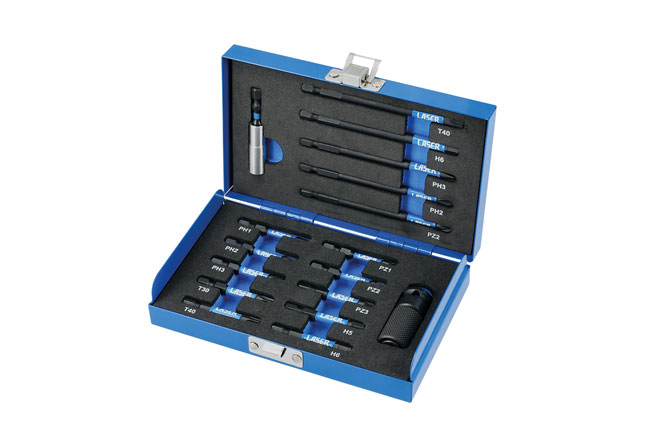 • Includes 50mm long bits: Phillips: Ph1, Ph2, Ph3, Torx®: T30, T40, Pz Drive: Pz1, Pz2, Pz3; Hex: 5, 6mm. 100mm long bits: Phillips: Ph2, Ph3, Torx®: T40; Pz Drive: Pz2, Hex: 6mm.