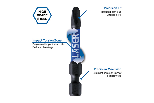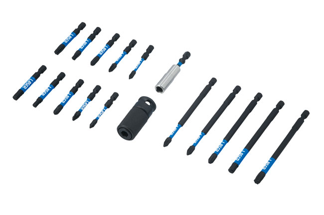A 17 piece torsion bit set, designed with flex specifically for use with impact drivers and power tools.