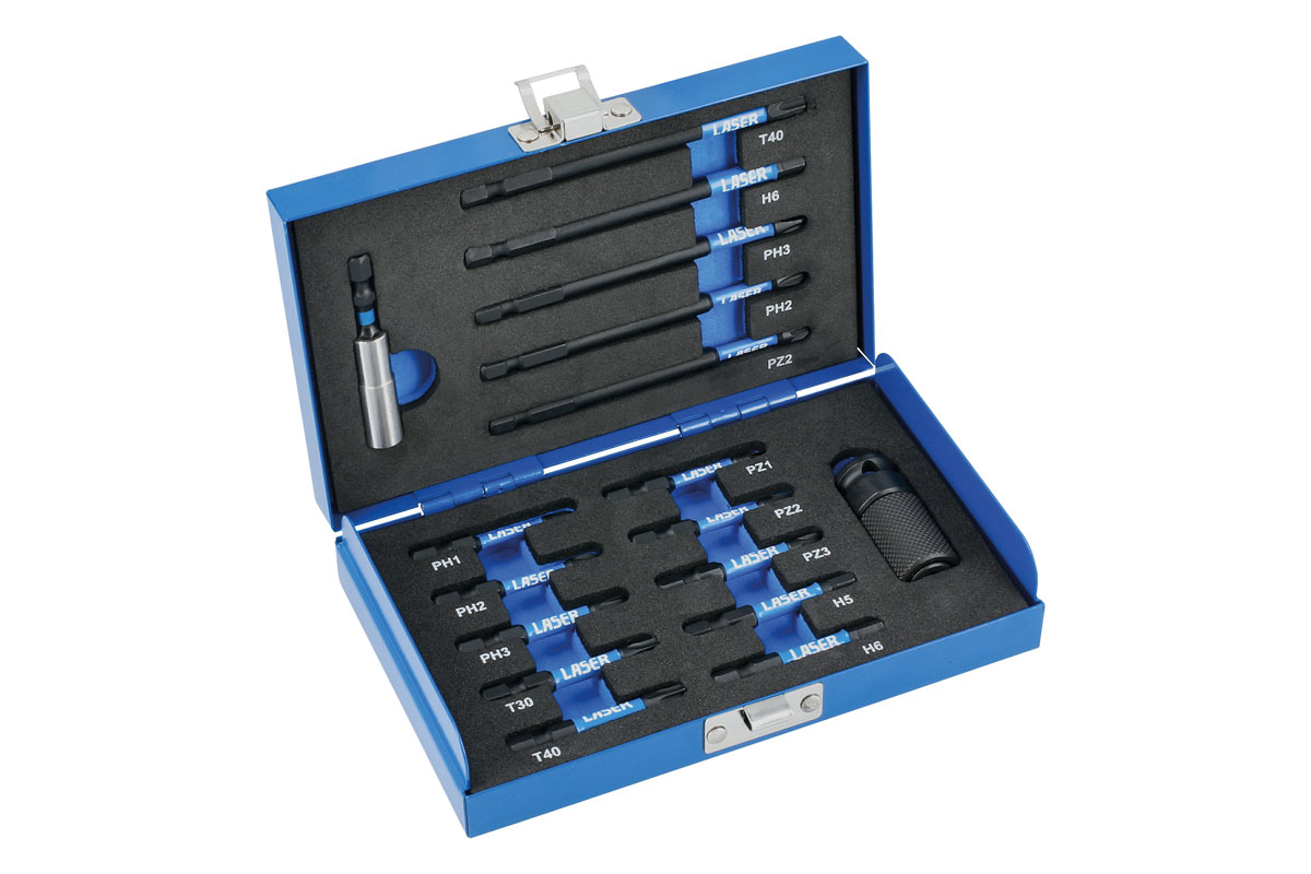 • 15 torsion bits with colour coating, designed for heavy duty impact applications. Longer length bits are ideal for difficult to access areas.