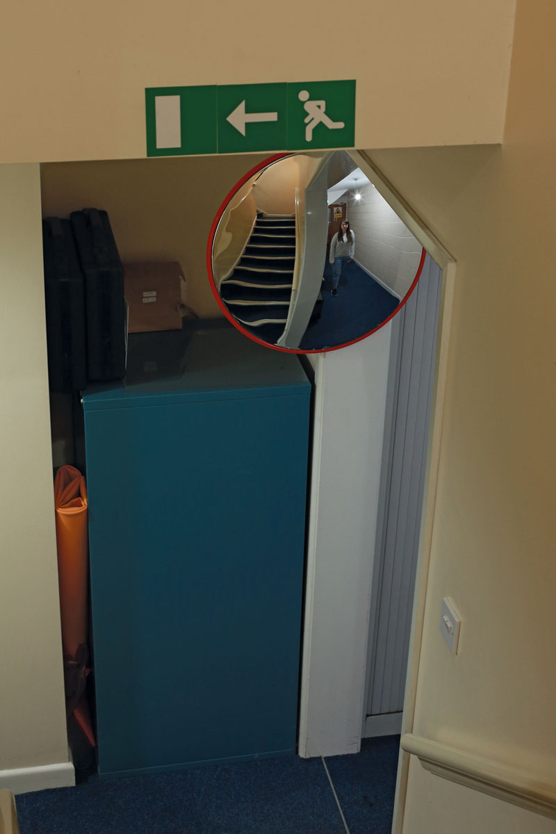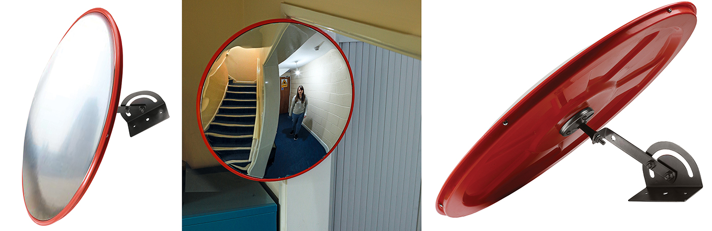 Convex safety traffic mirror eliminates blind spots assisting accident prevention. A useful additional safety measure for social distancing, providing greater visibility on stairwells and blind corners.