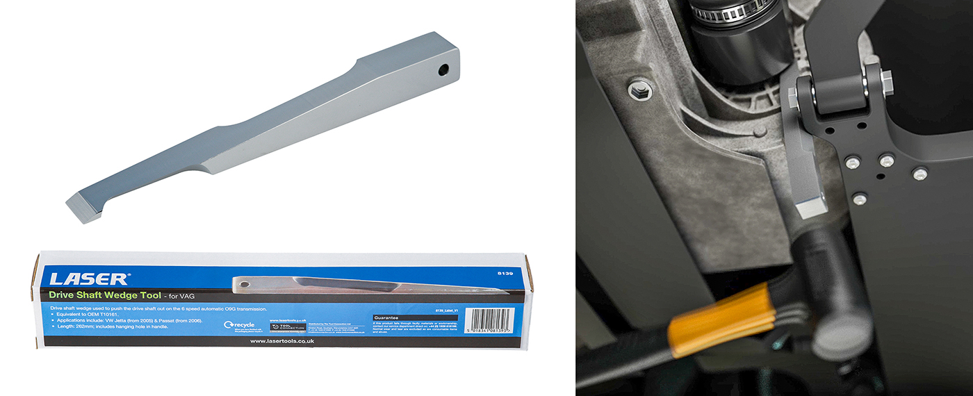 Working on the VW Group 6-speed 09G automatic transmission? Need to split the drive shaft from the transmission? Then reach for the special drive shaft wedge tool (part number 8139) from Laser Tools. Manufactured in aluminium, the tool is specially designed to reach between the gearbox casing and the drive shaft — a few steady hammer blows will force the wedge tool between the casing and the shaft, popping the shaft out.