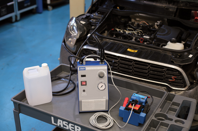 - Um maximale Mobilität zu gewährleisten, wurde dieser Bremsenentlüfter für die Verwendung mit einem 5-Liter-Bremsflüssigkeitsbehälter (im Lieferumfang enthalten) konzipiert. Verwendung mit geeigneter Auffangflasche – siehe Laser Teile-Nr. 6592.