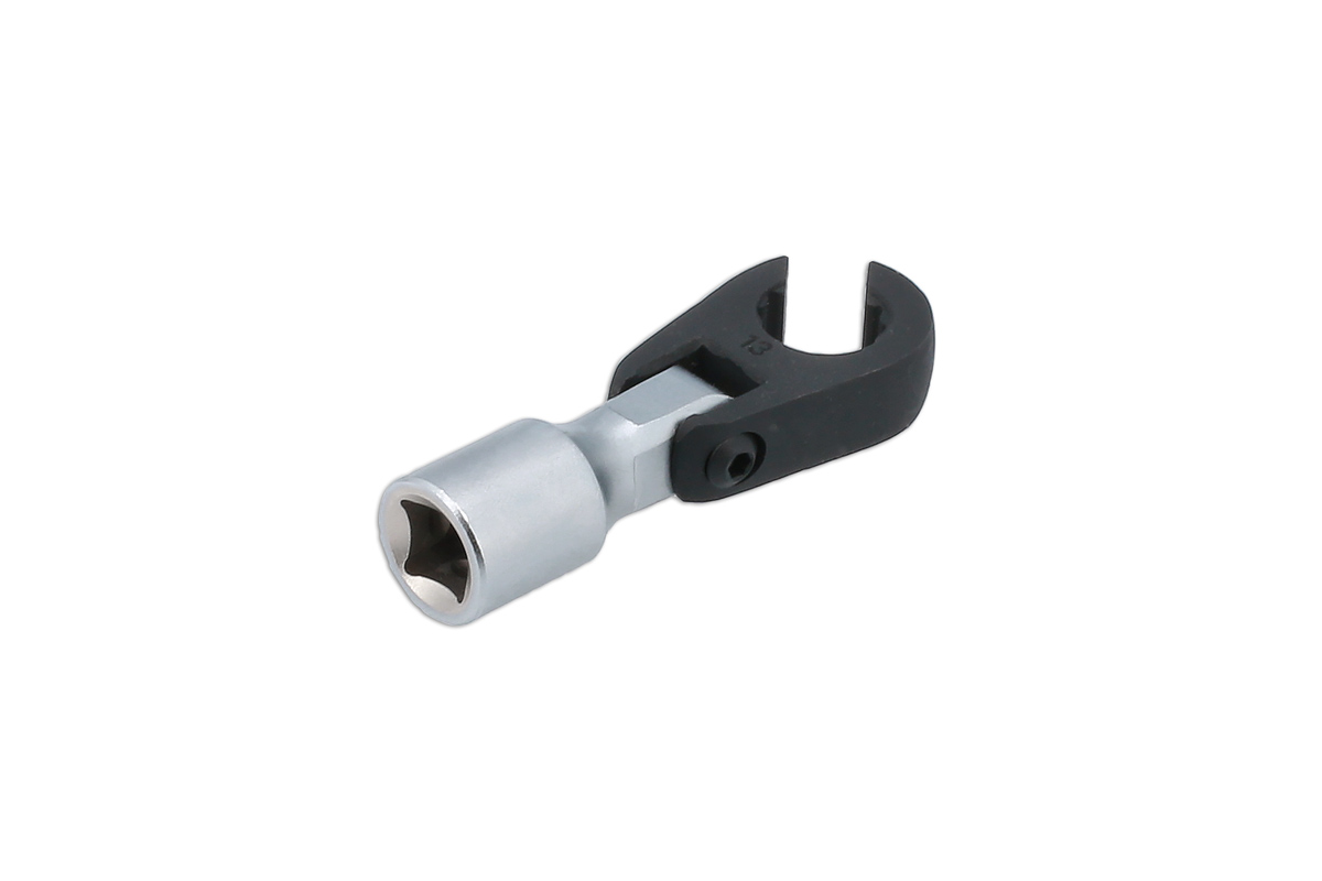 Een kraaienpootsleutel van 13 mm met flexibele kop voor gebruik met een ratel met 3/8"-vierkantaandrijving. De flexibele kop maakt hem ideaal voor lastige of moeilijk bereikbare plaatsen, terwijl het open uiteinde gebruik op flensmoeren of sensoren mogelijk maakt.