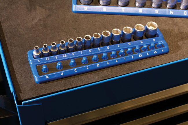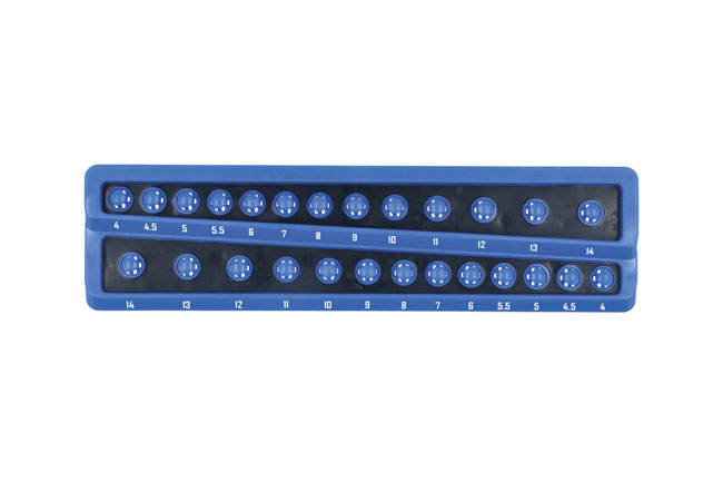 - Socket organiser, holds 26 standard or deep 1/4"D sockets, featuring a twist & lock function to keep the sockets in place.