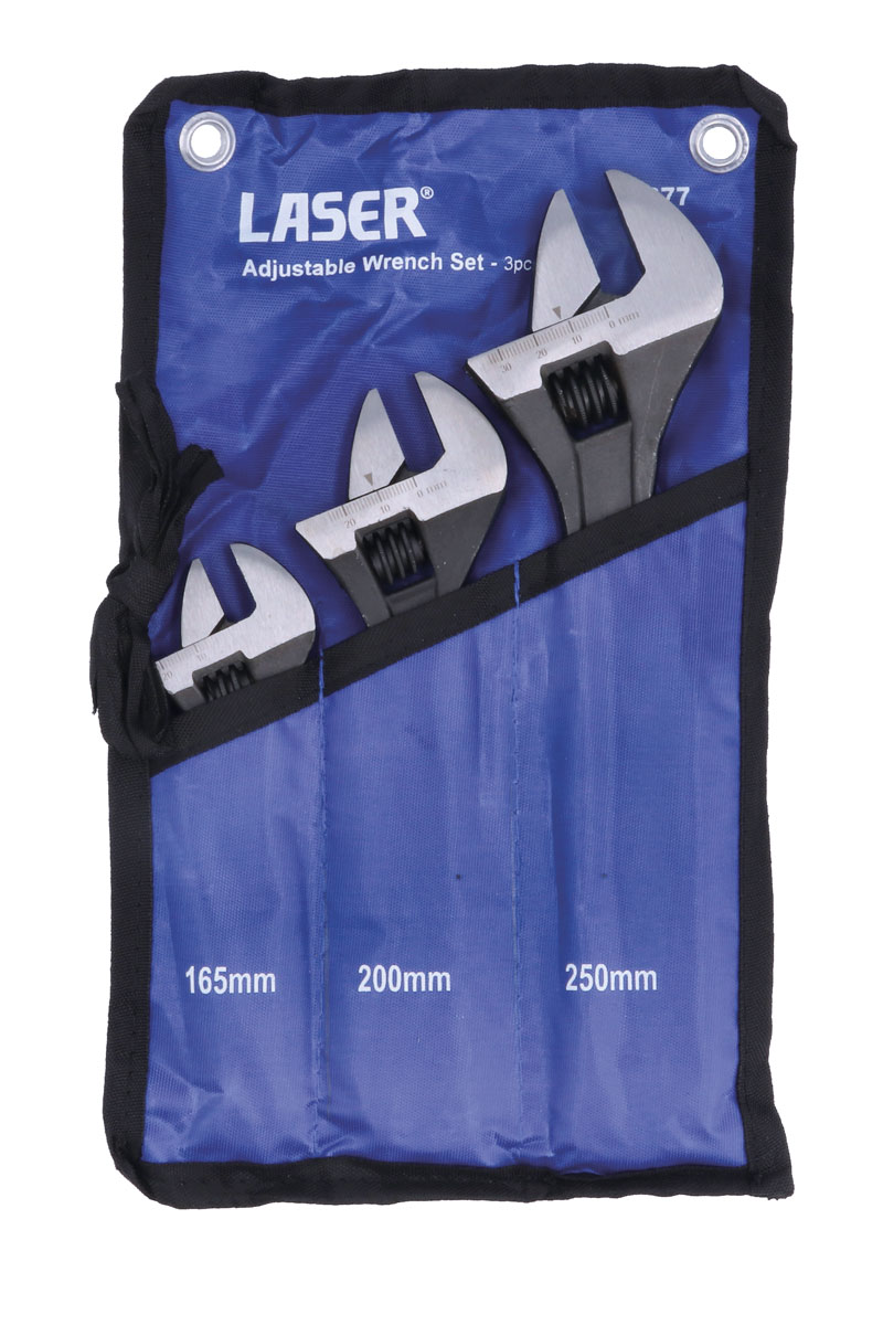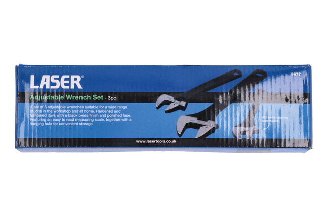 A set of 3 adjustable wrenches suitable for a wide range of jobs in the workshop and at home. Each of the wrenches are manufactured from chrome vanadium, with hardened and tempered jaws, together with a black oxide finish with a polished face and featuring an easy to read measuring scale.