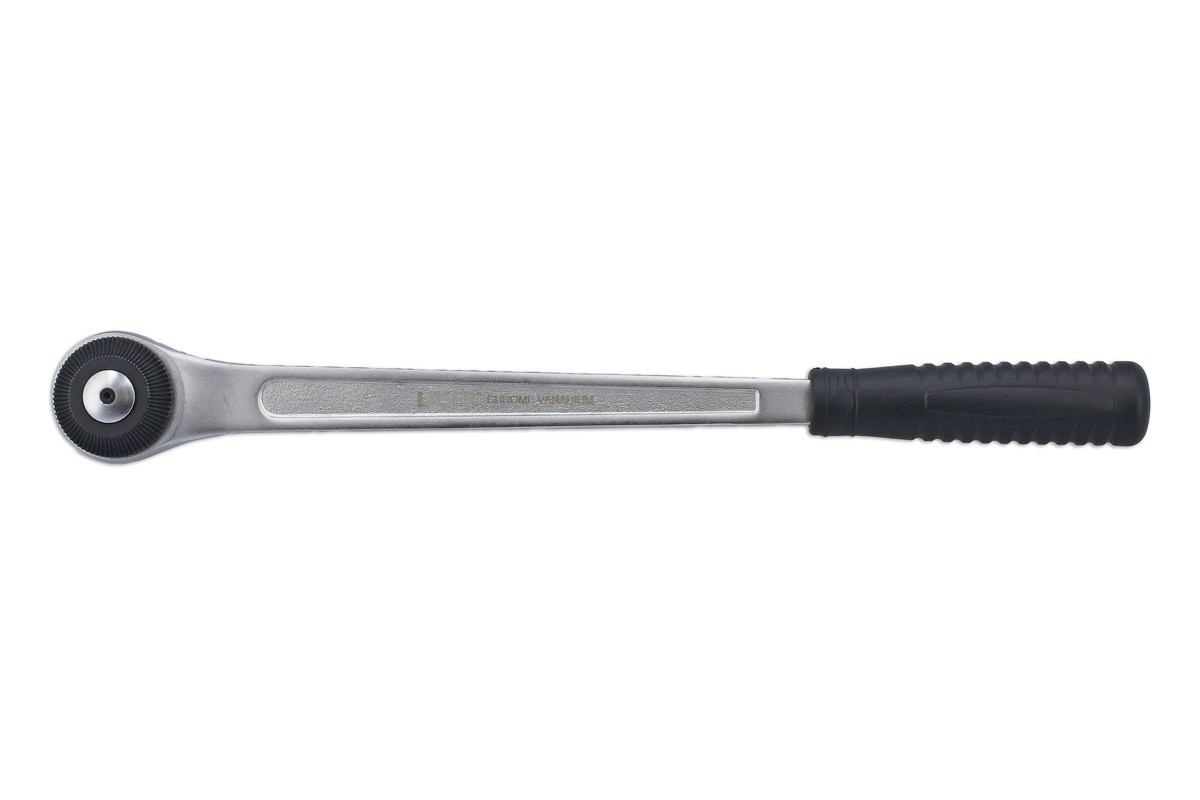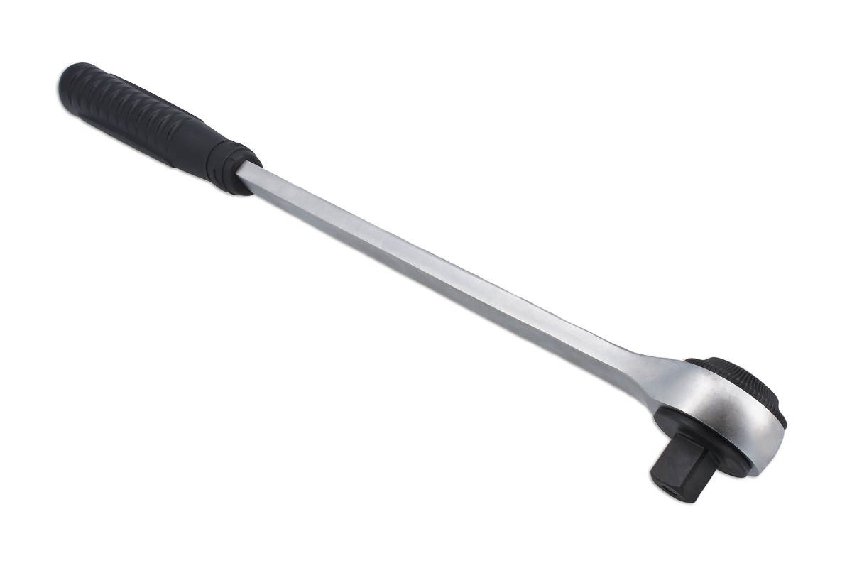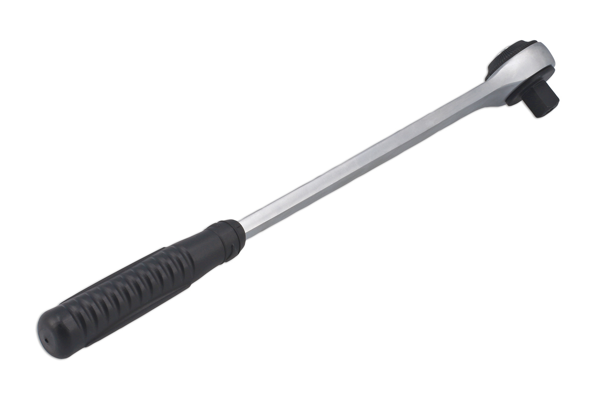 A 3/4"D ratchet with a reversible 72 teeth mechanism and a safety lock to hold the socket in place, preventing it from detaching from the head and causing damage or injury. Measuring 504mm in length, the slim-line design helps to keep the wrench robust whilst saving weight on a regular 3/4"D ratchet, and it also features a rubberised handle for better grip.
