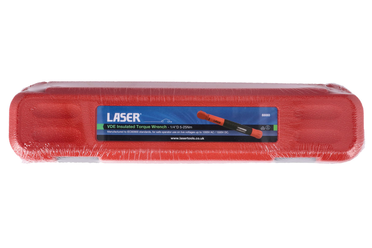 A 1/4"D click type torque wrench, fully insulated to IEC60900 standards for 1000vAC/1500vDC live working, and ideal for use on hybrid and electric vehicles. It features an easy to read scale, has a range of 5-25Nm, and is adjusted by a pull-out collar at the base of the handle in 0.25Nm increments.