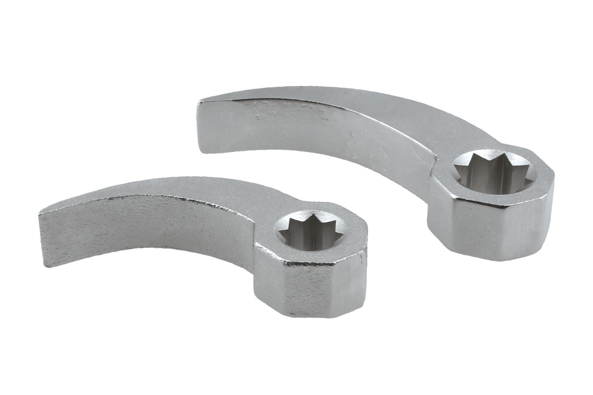 - Paire de têtes d’adaptation pour pied-de-biche, à utiliser avec une barre de force, une clé ou un cliquet à roue. Peuvent également être utilisées avec une clé à fourche de 24 mm et 27 mm.